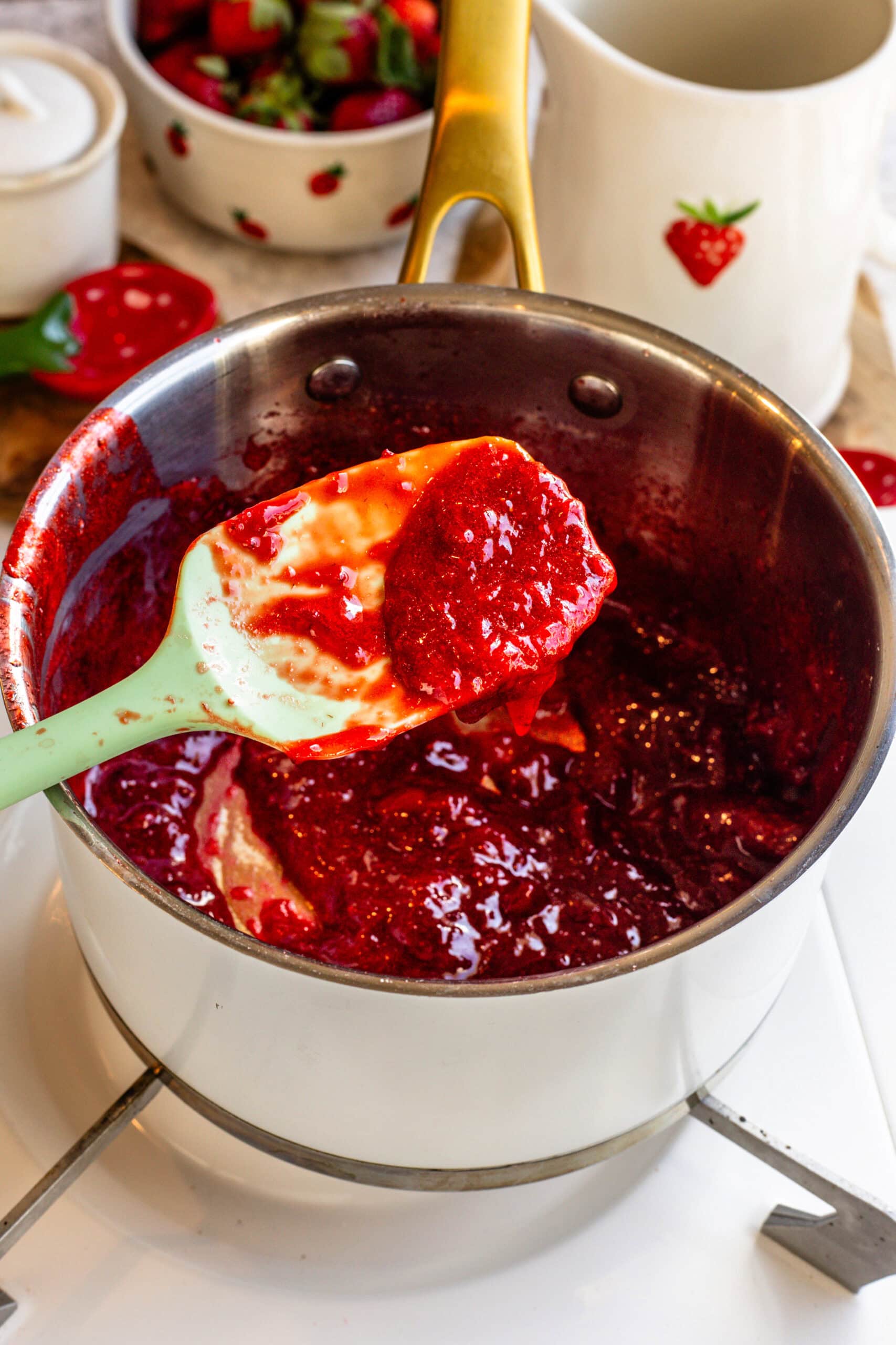 The strawberry reduction should be falling off the spatula in soft chunks rather than running. Always let it cool down completely before using.