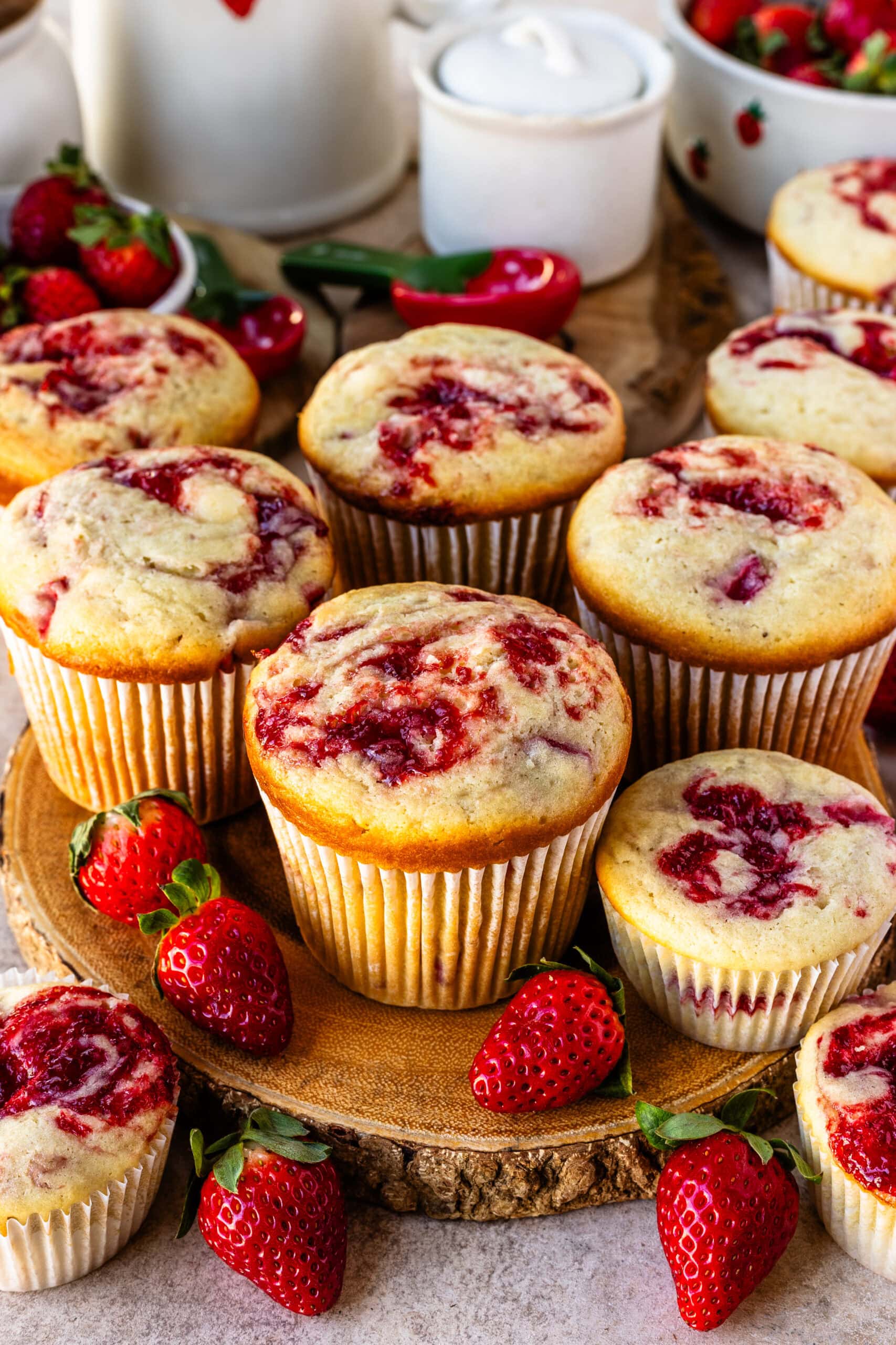 To deepen the strawberry flavor, this recipe uses a homemade strawberry reduction folded into the batter, not just chopped fresh strawberries. This concentrates the strawberry taste and aroma, creating bakery-style muffins that rise tall, bake up tender, and deliver bold strawberry flavor from top to bottom.