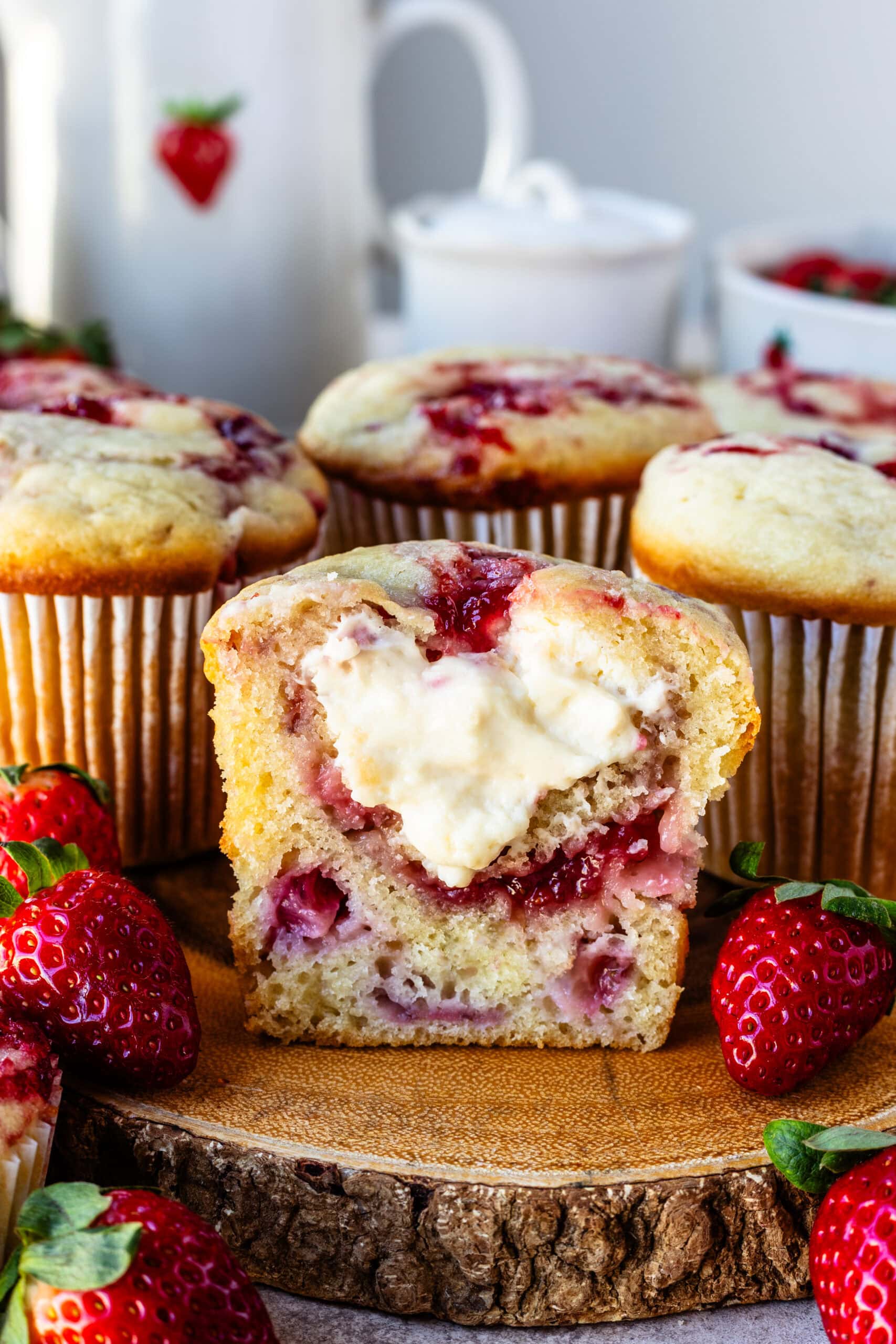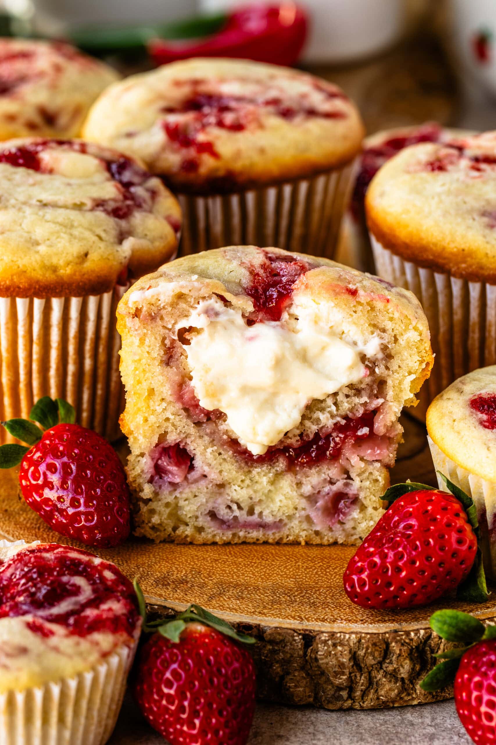 These strawberry cream cheese muffins are soft, fluffy, and filled with a rich cream cheese center inside, making them extra special compared to classic strawberry muffins. I developed this recipe when my family was visiting from Brazilโmy sister loves strawberry muffins, and I had cream cheese in the fridge that needed to be used. The result was an elevated version of my regular strawberry muffin recipe, with a creamy filling that adds richness and contrast in every bite.