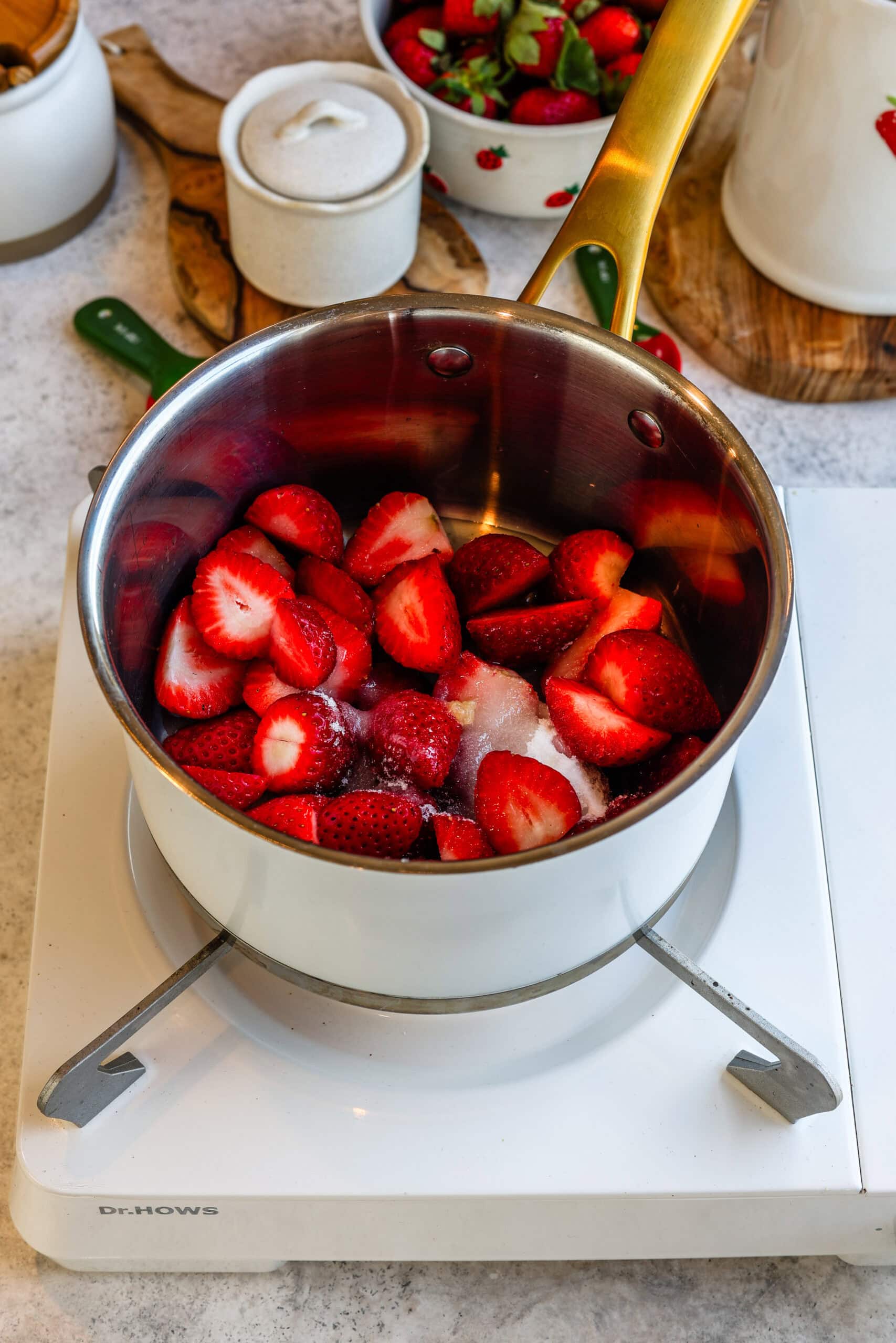 I like to cook the strawberries for about 30 minutes, until the mixture has reduced to a thick spoonable sauce.