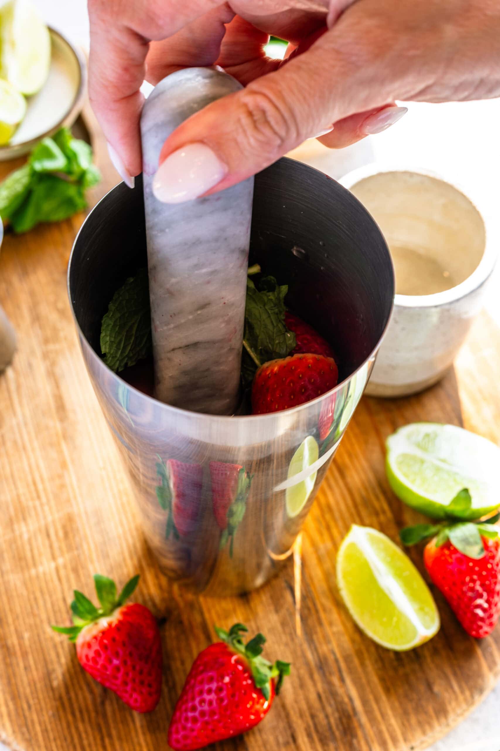 - Add the strawberries, mint leaves, and simple syrup to a sturdy glass, jar, or cocktail shaker. Gently muddle just until the strawberries release their juice and the mint becomes fragrant. Avoid over-muddling the mint.