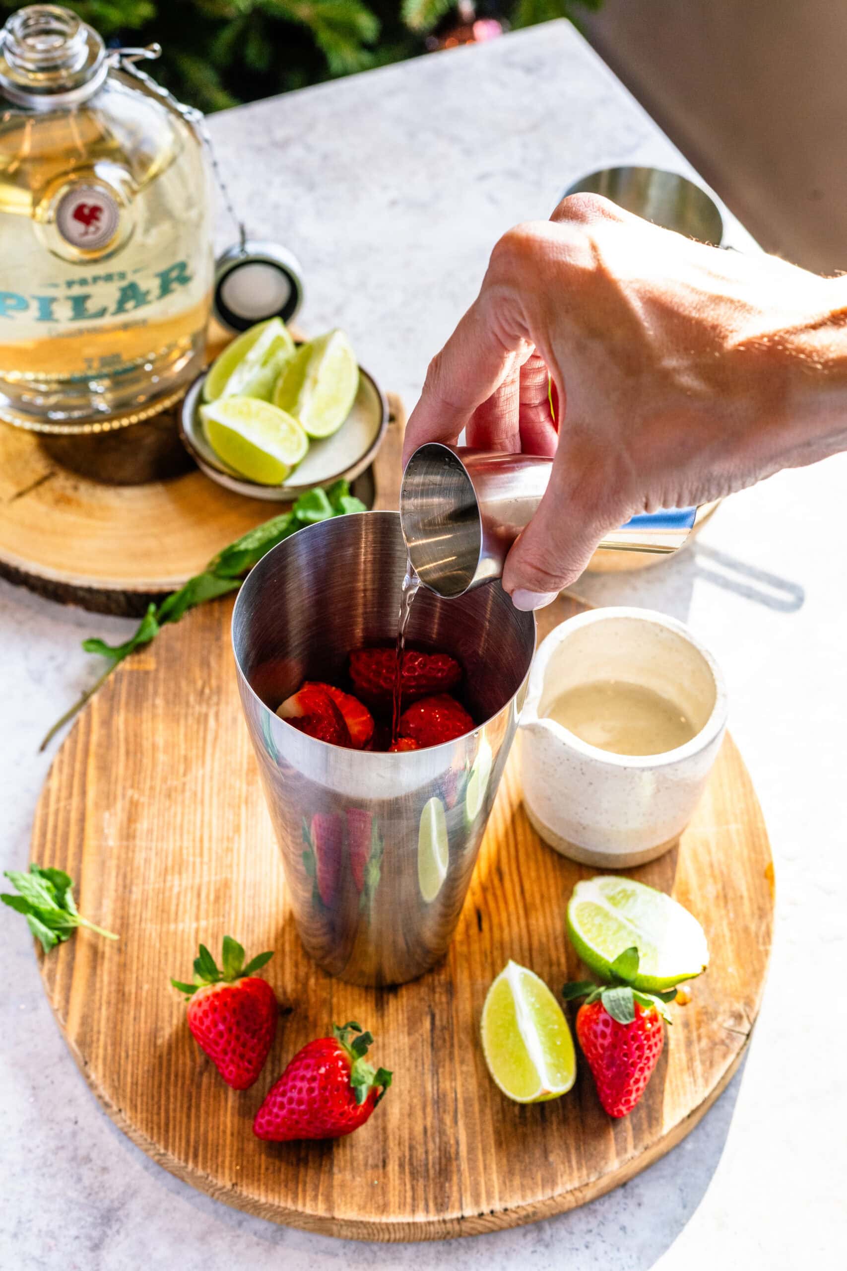 I add the strawberries, mint leaves, and simple syrup to a sturdy glass, jar, or cocktail shaker.