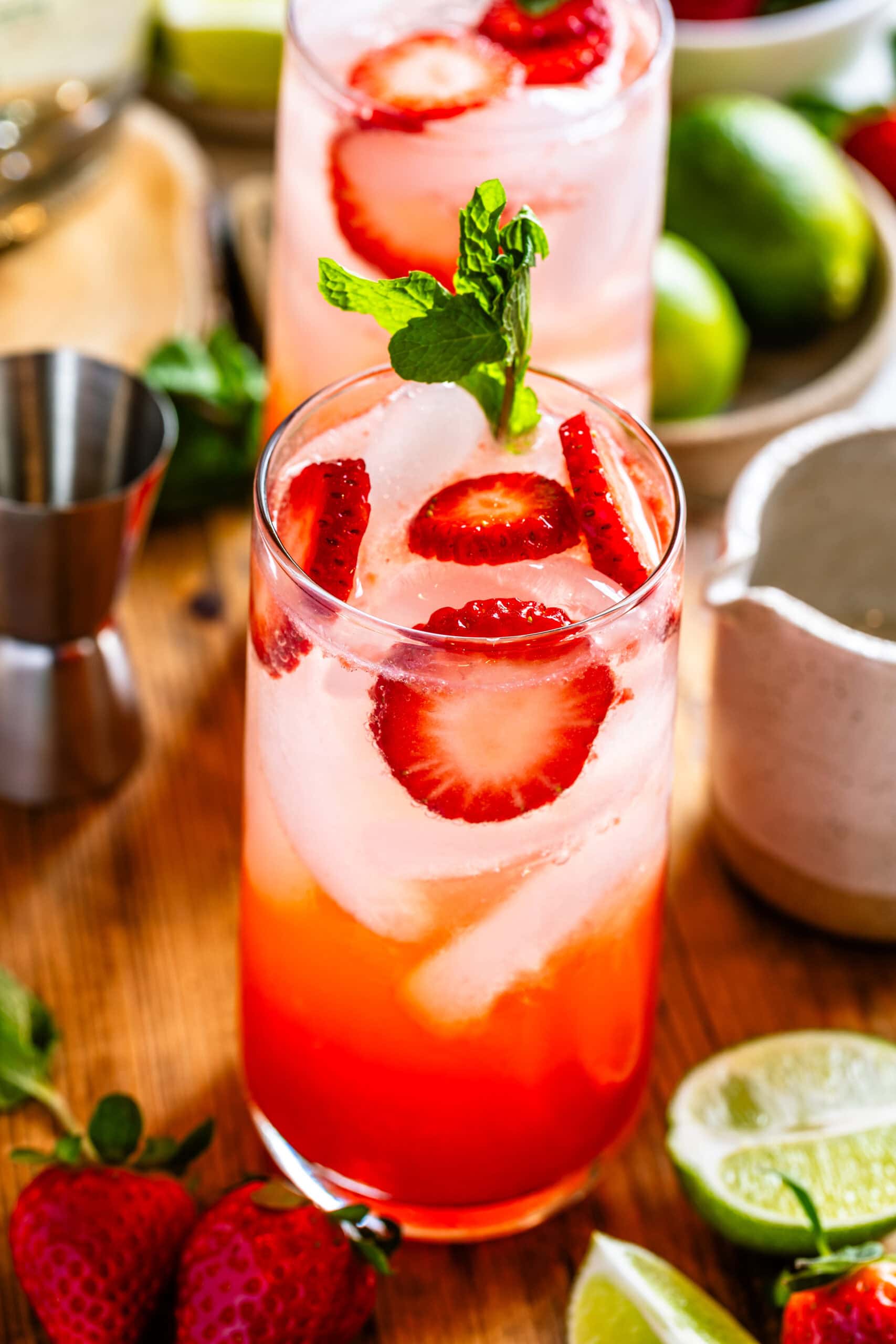 - Top with club soda, stir gently, garnish with mint and a sliced strawberry, and serve immediatel