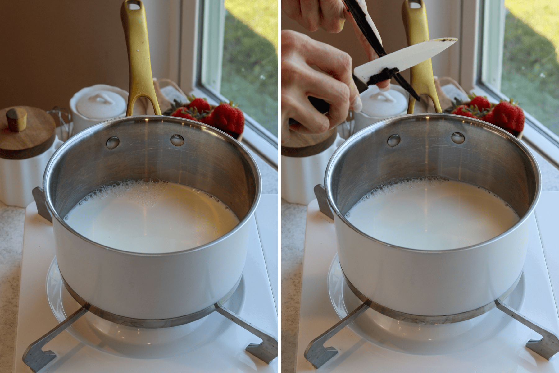 - Split the vanilla beans in half and remove the seeds. Place the vanilla bean seeds and milk in a saucepan over medium heat along with the vanilla bean pods and bring to almost a simmer. If using vanilla extract instead of vanilla bean seeds, you should add it later once the custard is done cooking, so for now, just heat up the milk by itself on the stove.