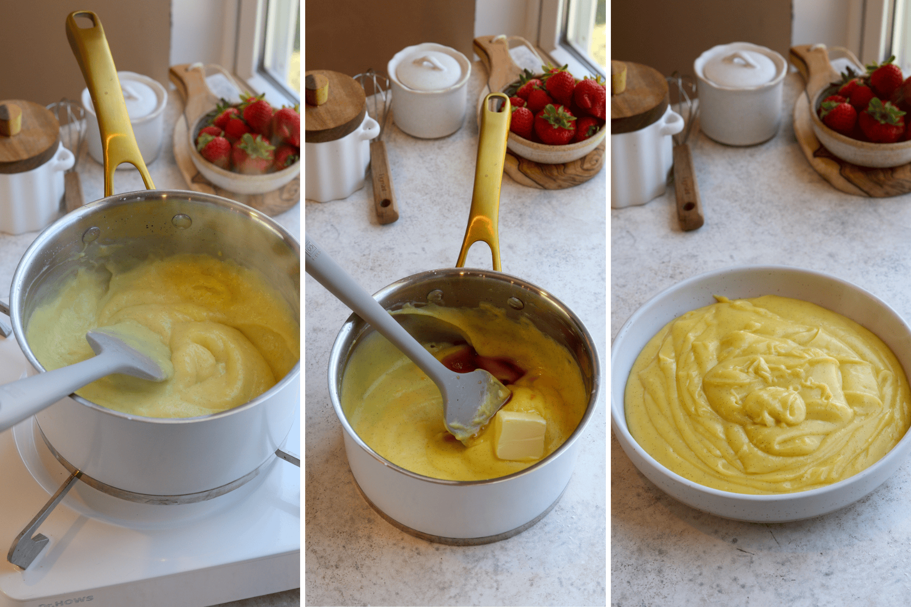 - Place the pan over medium heat, and begin to cook the custard stirring non-stop.