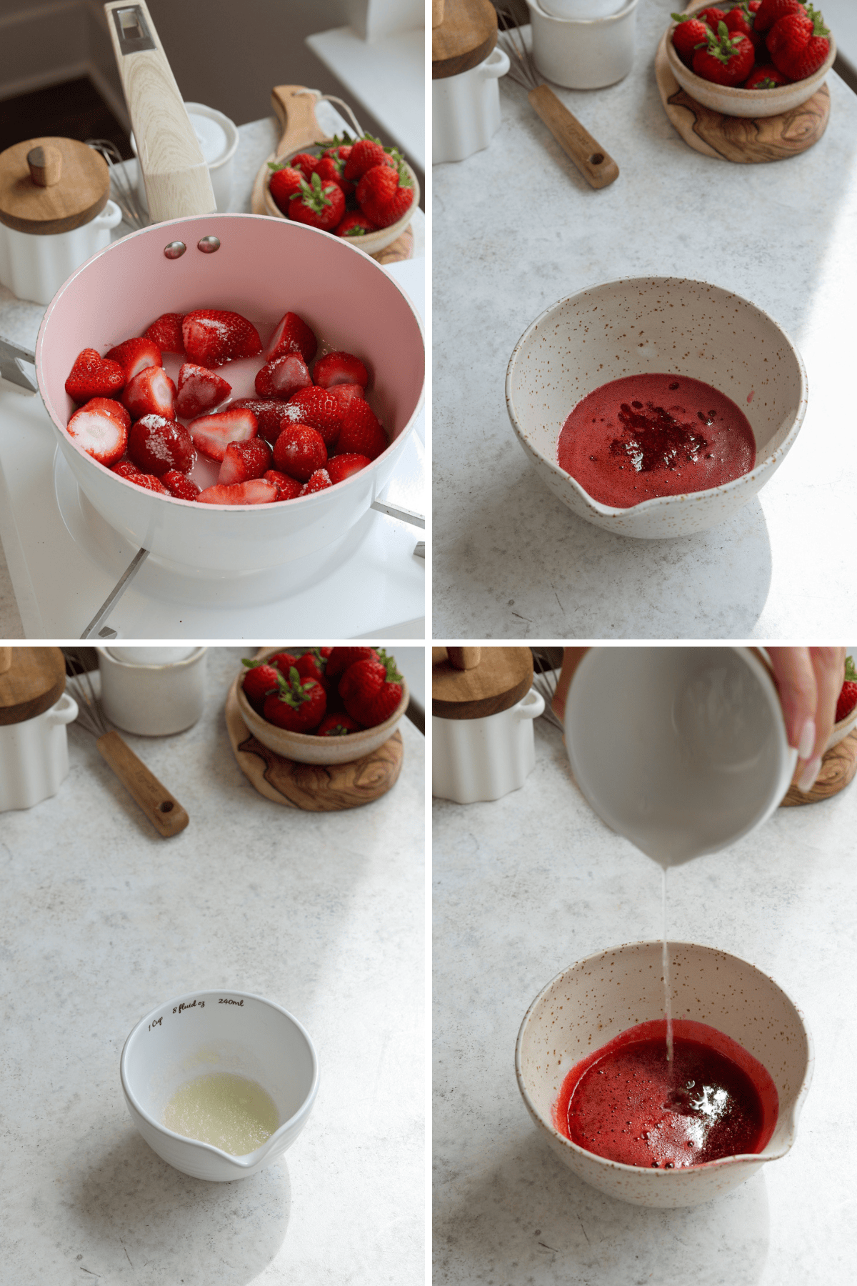 Meanwhile, bloom the gelatin powder. In a small bowl, sprinkle the gelatin over 1 tbsp of cold water and let sit for 5โ10 minutes. Microwave briefly to dissolve, then whisk it into the warm strawberry sauce. Let the mixture cool slightly before using.