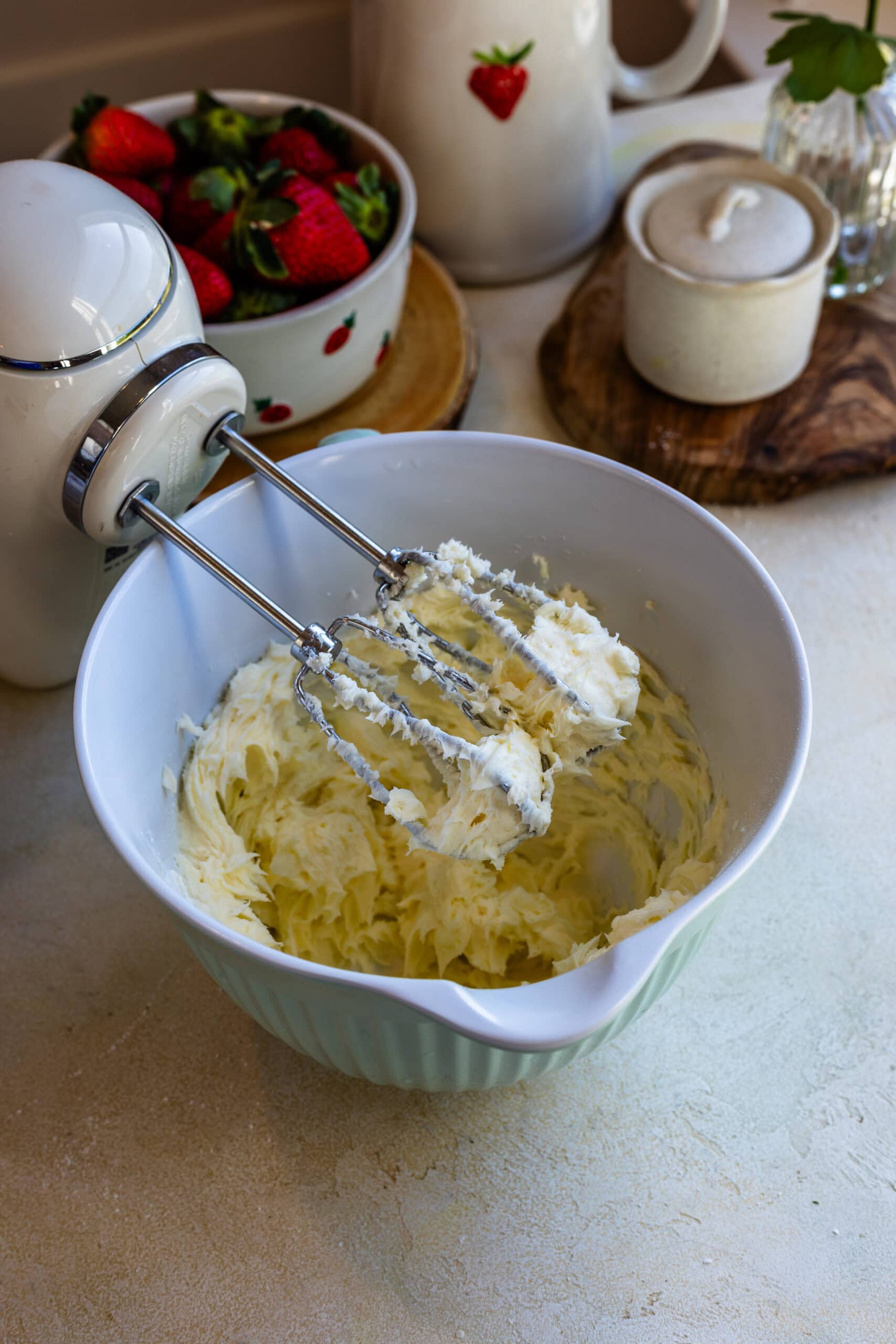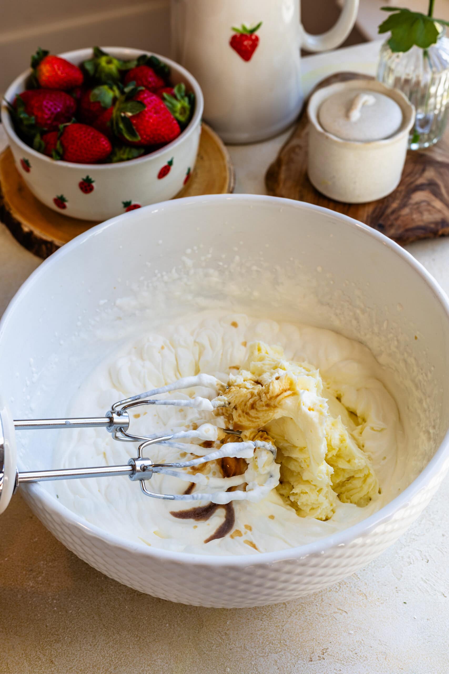 - Beat the cream cheese with powdered sugar and vanilla until smooth, about 1 minute. Set it aside.