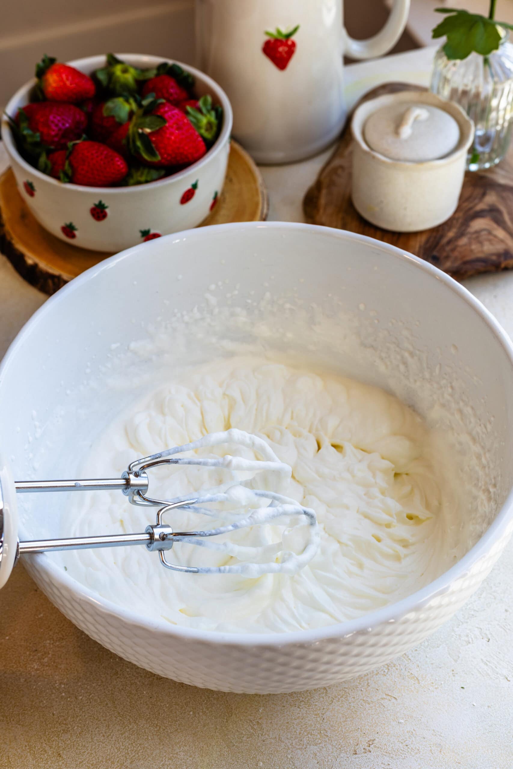 Whip the cold heavy cream until medium-stiff peaks form. Stop before it looks grainyโover-whipped cream makes the filling heavy.
