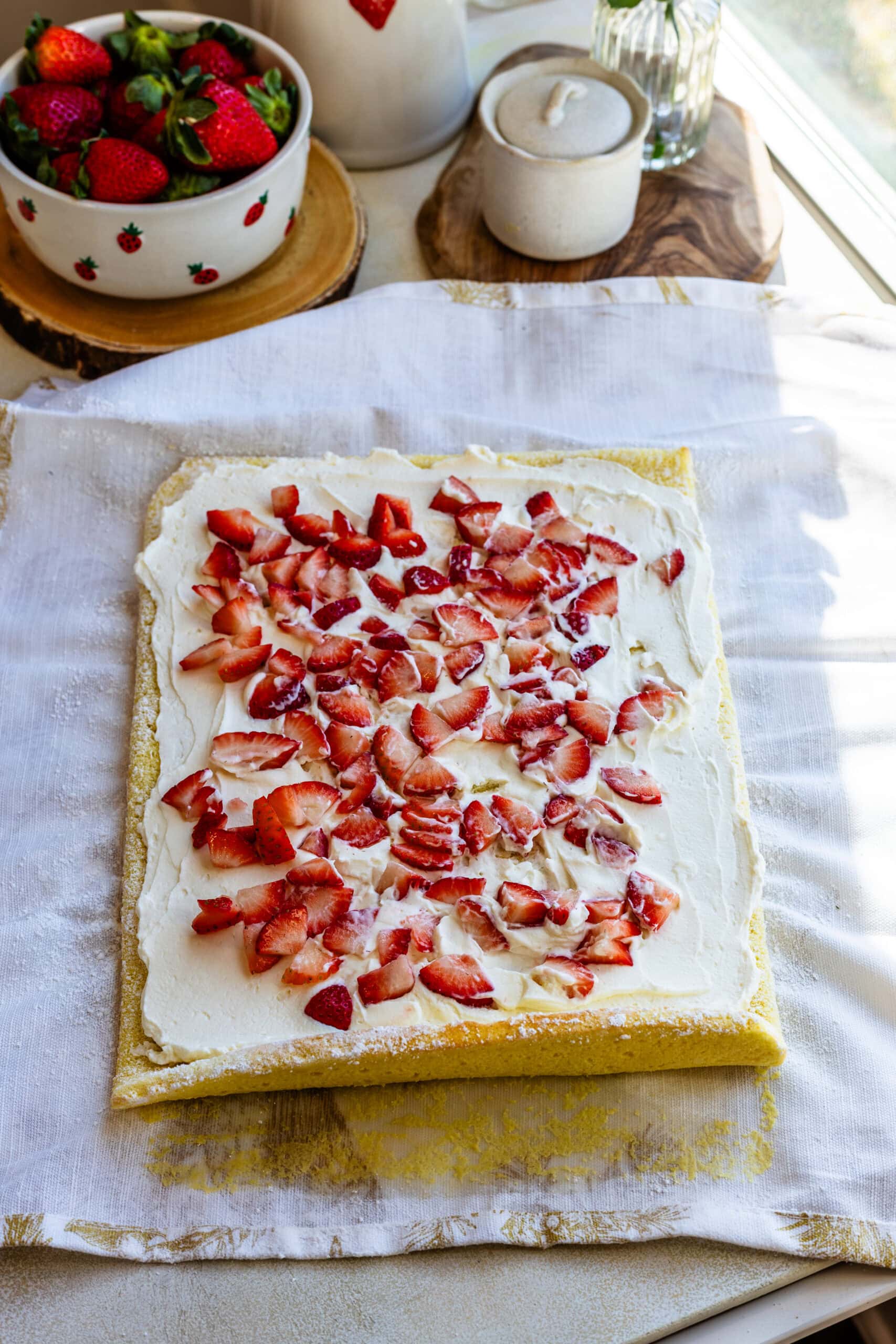 Now, roll the cake back up with the filling. Keep the roll tight but not forced. Spread the remaining cream on top, smoothing it with a spatula, and pipe any extra on top for decoration.