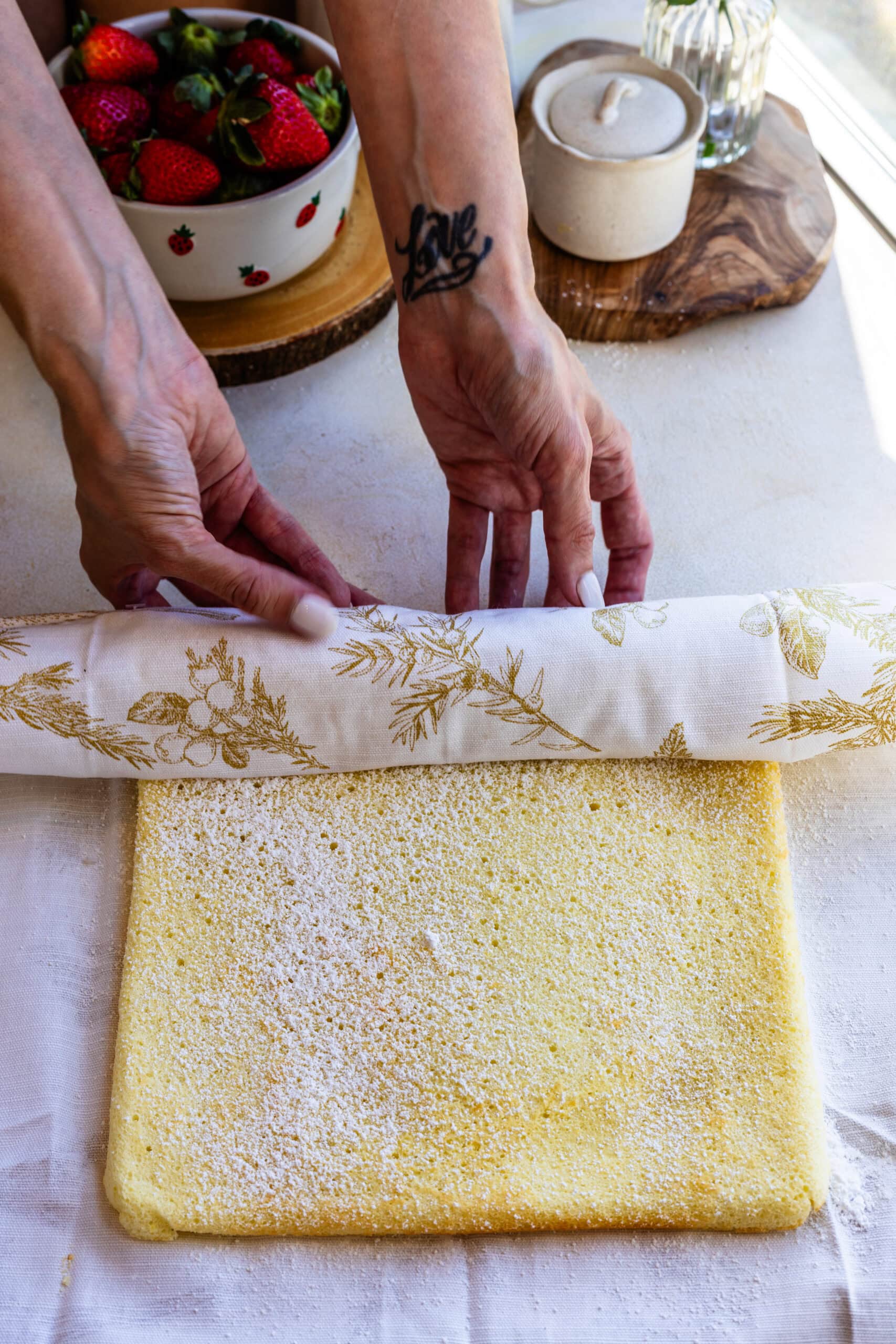 Rolling the sponge while itโs hot helps โtrainโ the cakeโs shape. Once cooled, the cake remembers the curve and rolls again easily without cracking.
