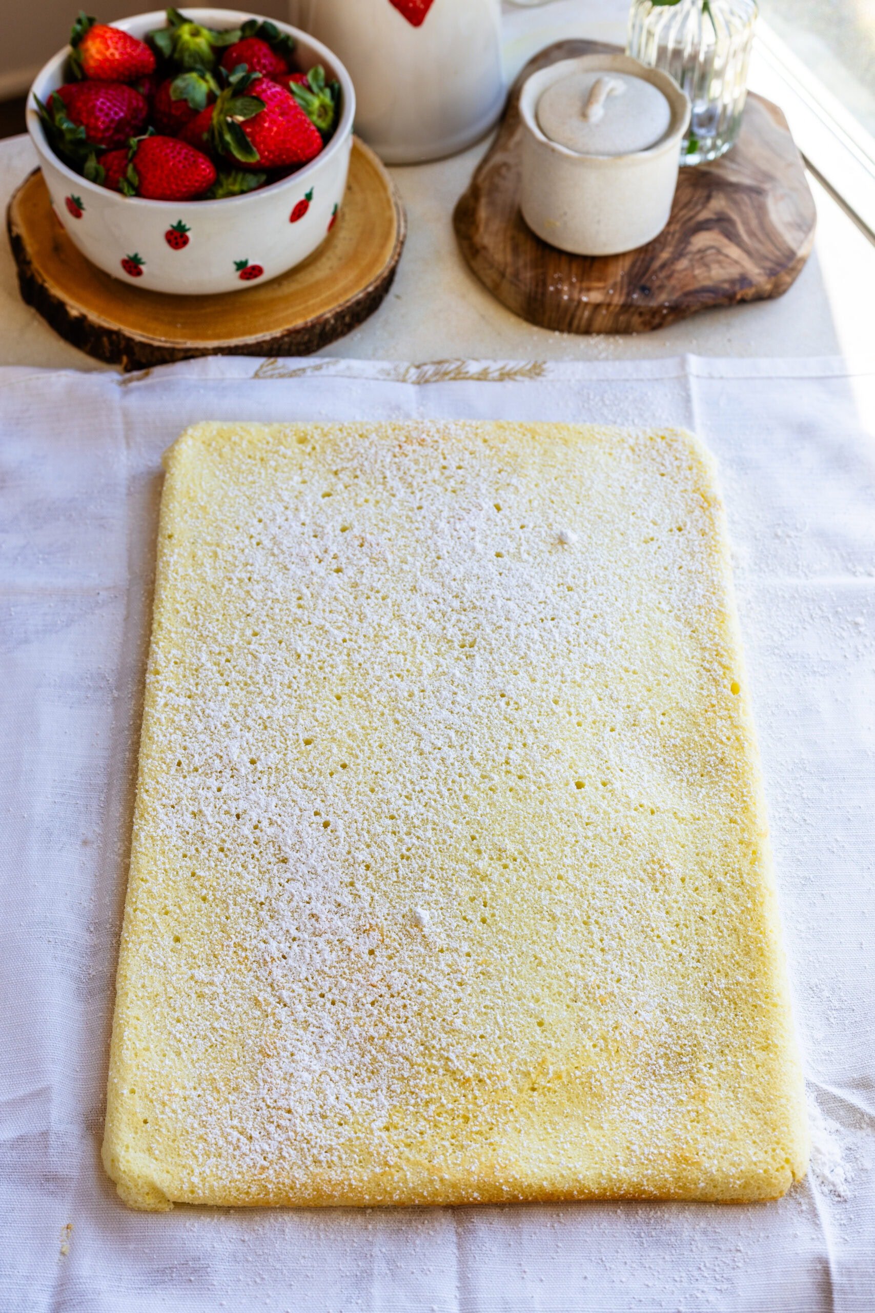 Let the cake cool completely in this rolled shape for about 45 minutes. This โtrainsโ the sponge into a spiral and makes unrolling much easier.