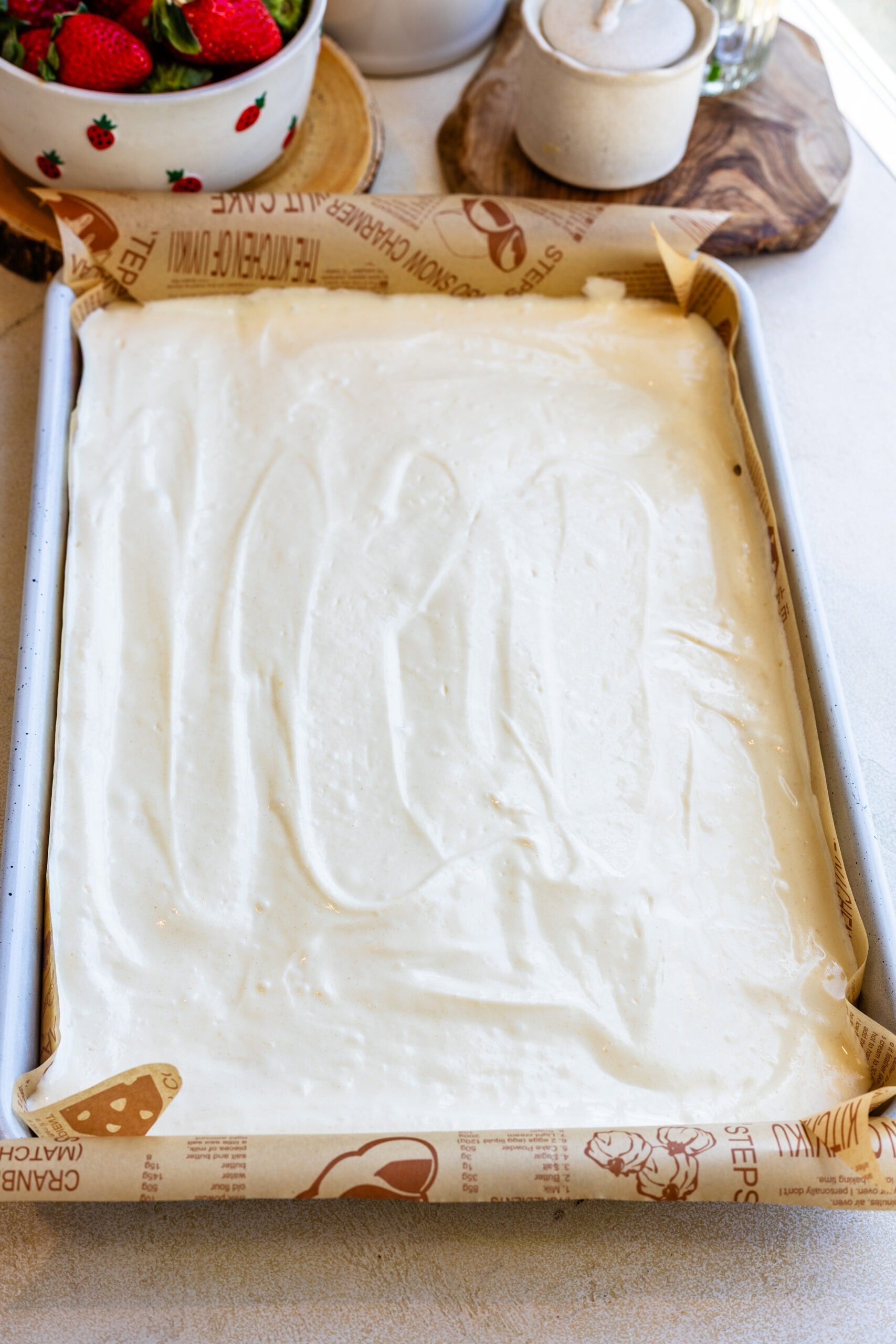 Spread the batter evenly in the prepared pan and smooth the top with a spatula.