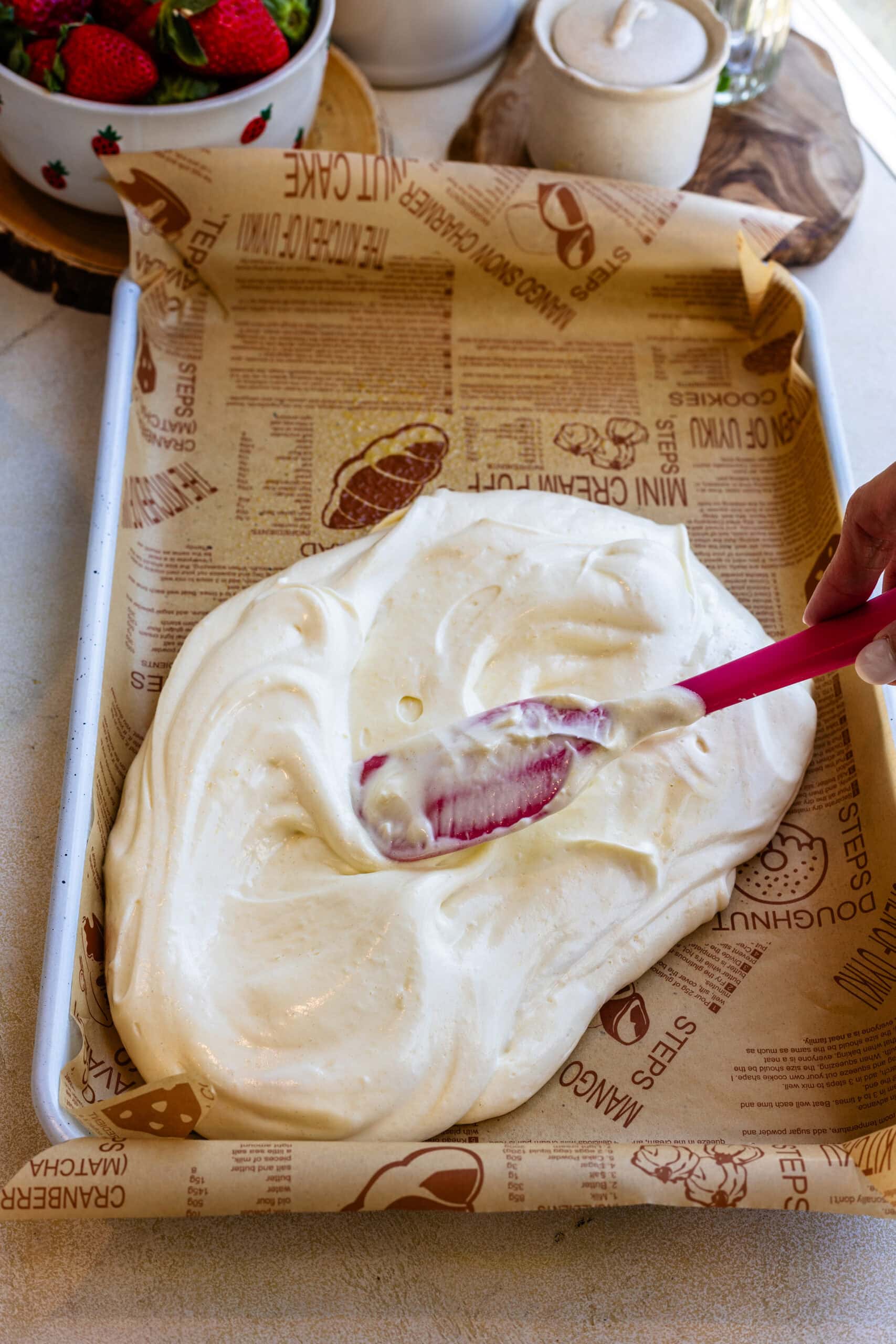 - Unroll the cooled cake. Spread a thin layer of the whipped cream evenly over the surface of the cake (about 2 cups). Reserve the rest for the topping.