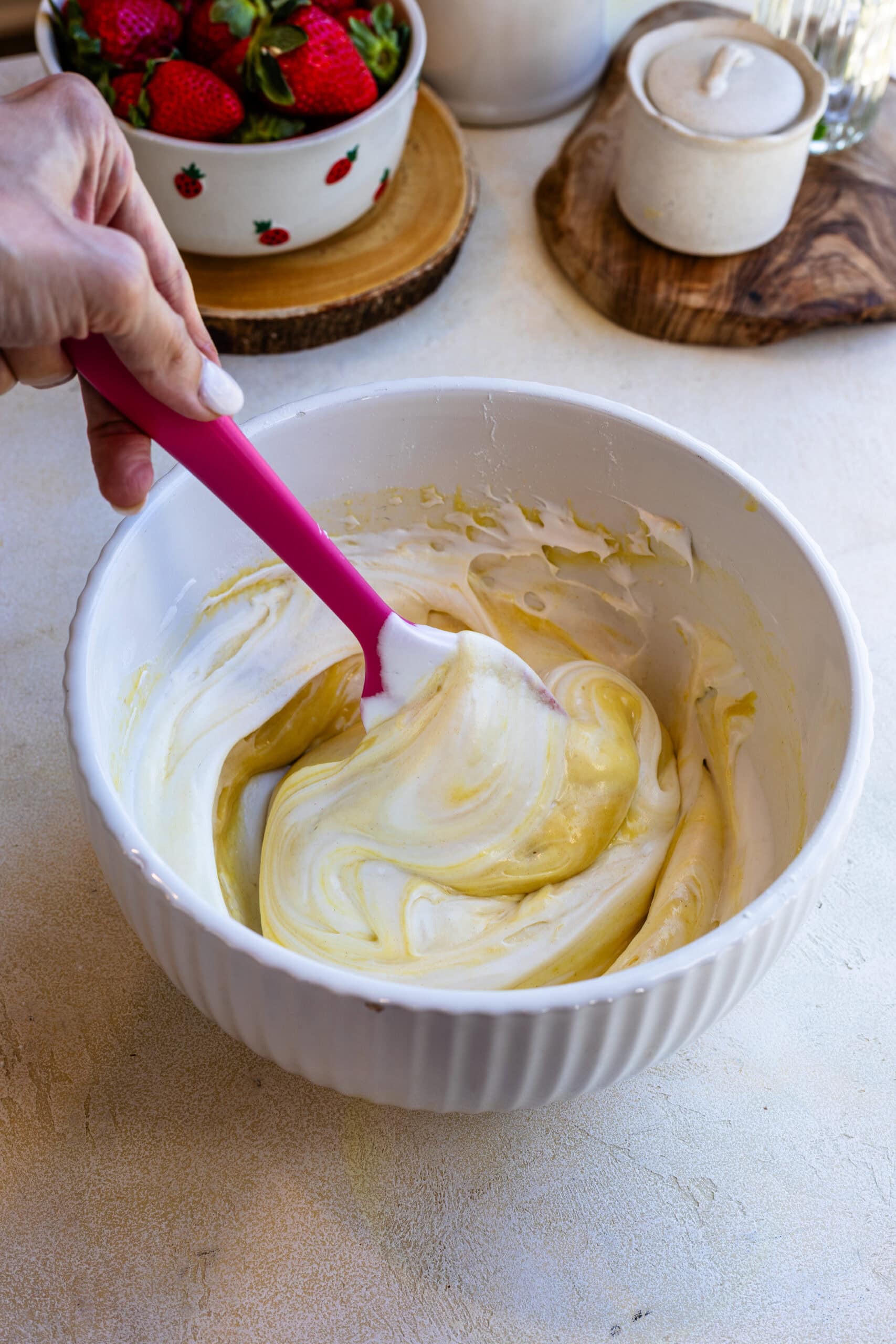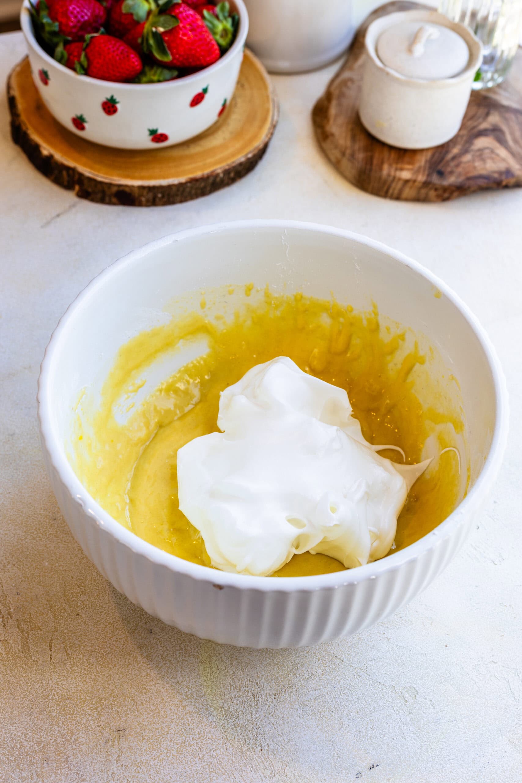 - Add โ of the meringue into the yolk batter and fold to combine. Add the rest in two additions, folding until no streaks of meringue remain.
