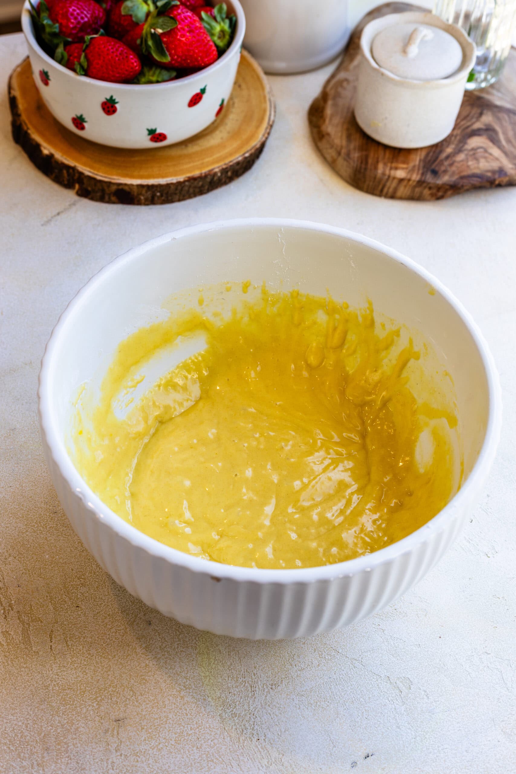 Add the melted butter, followed by the milk and vanilla, making sure everything is fully combined before moving on.