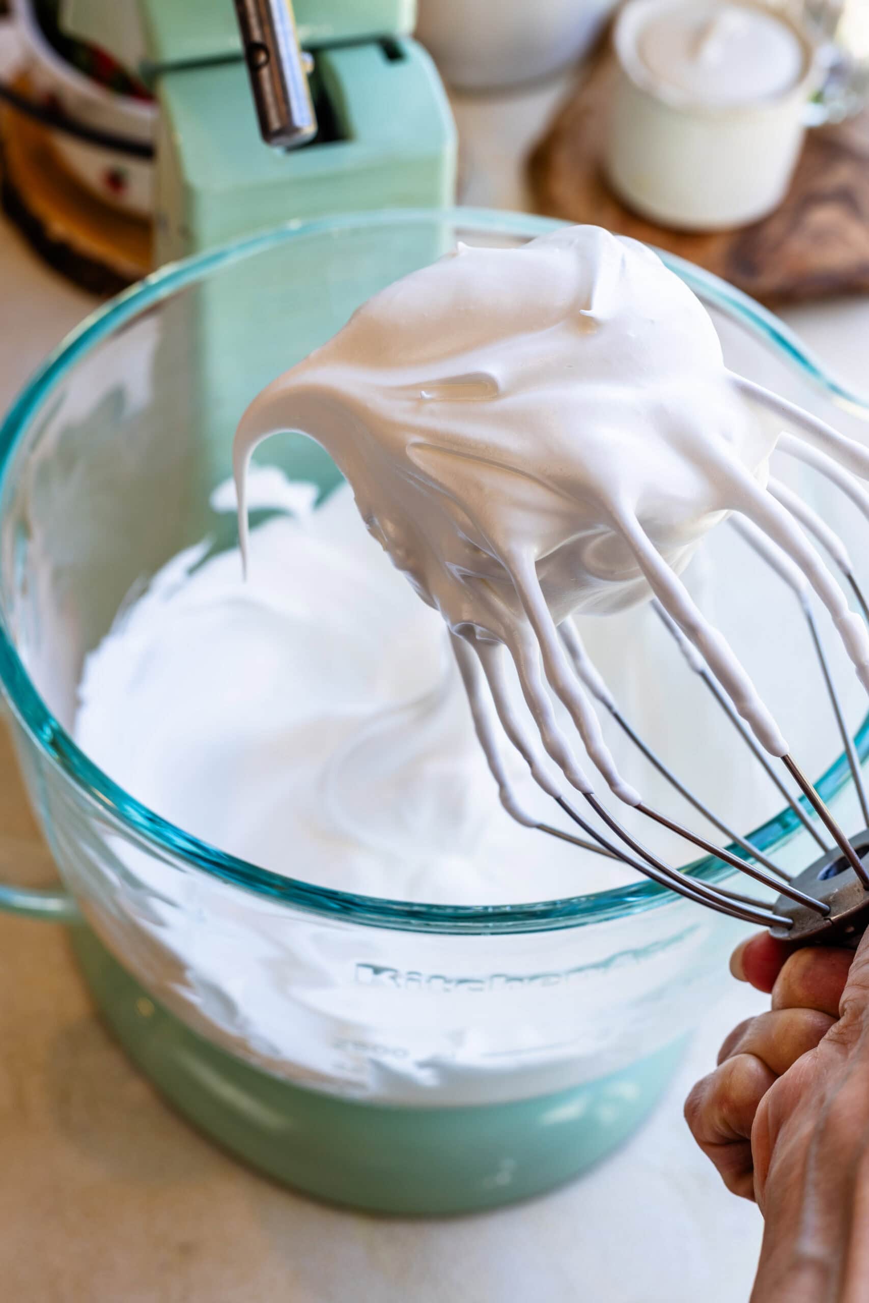 Look for peaks that are glossy, thick, and still bend at the tip. If the peaks stand straight and look dry or clumpy, theyโve gone too far, and the sponge will lose flexibility.