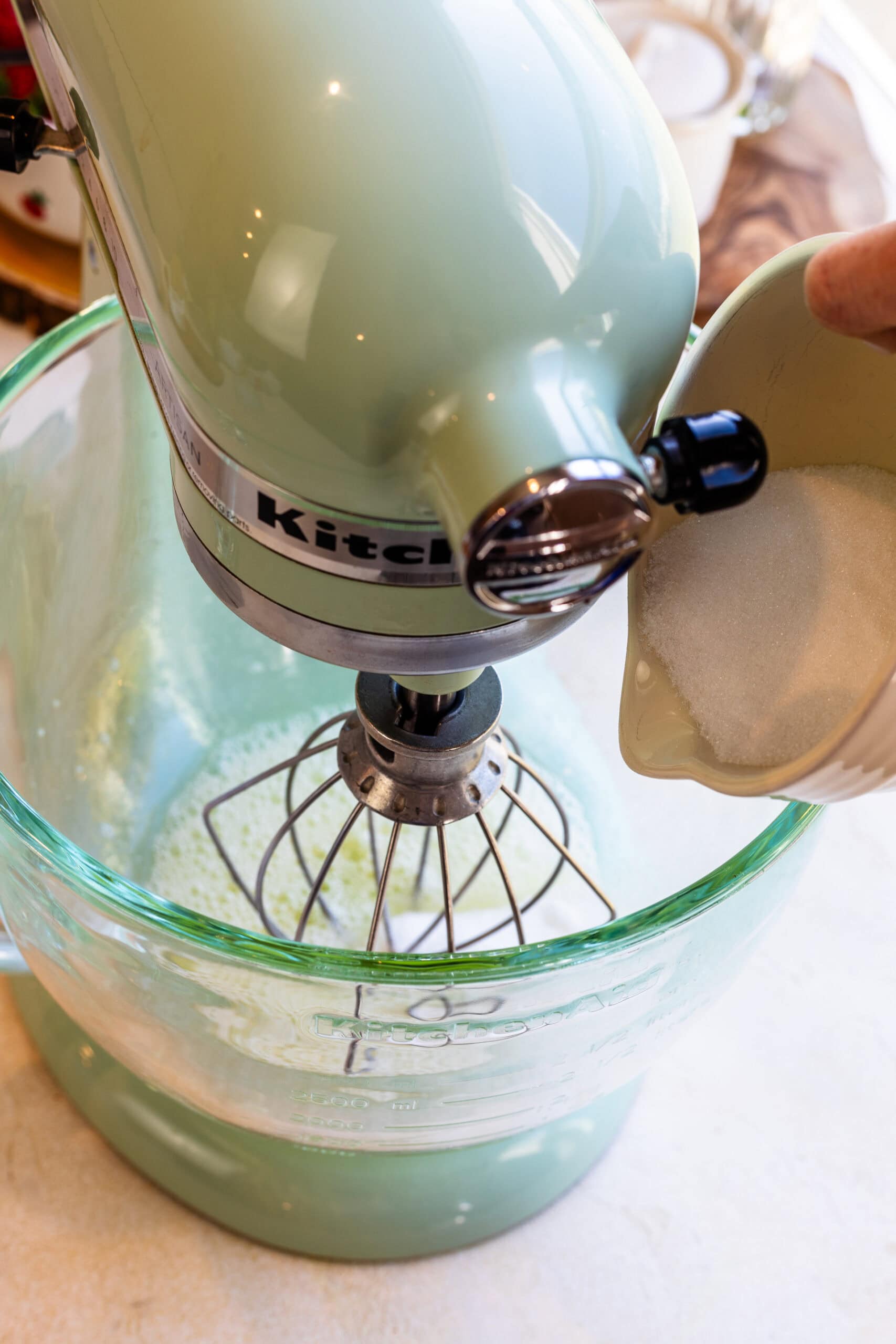Whip the egg whites in a clean bowl on medium speed. After about 30 seconds, once theyโre foamy, start adding the sugar gradually, one tablespoon at a time.
