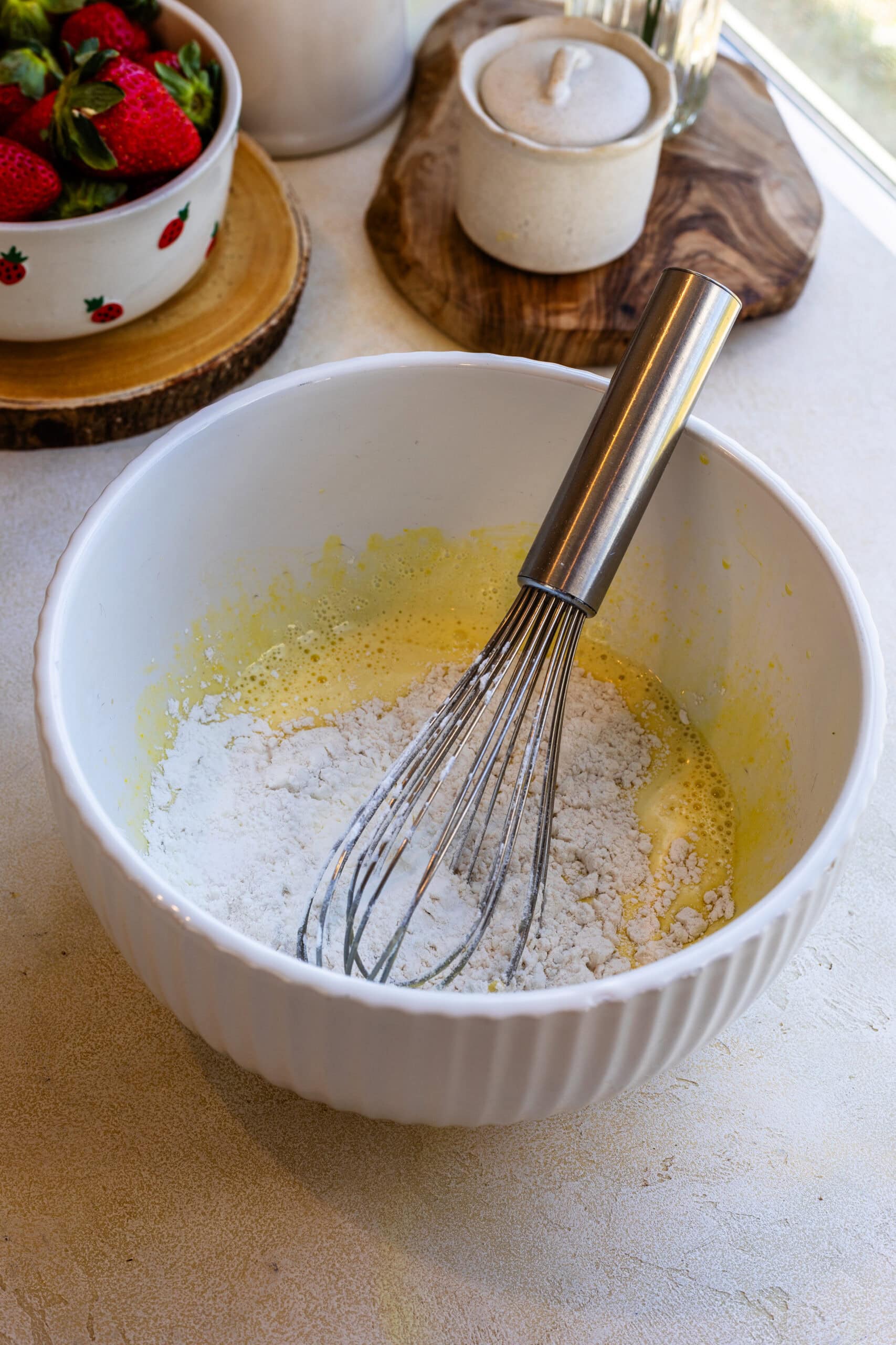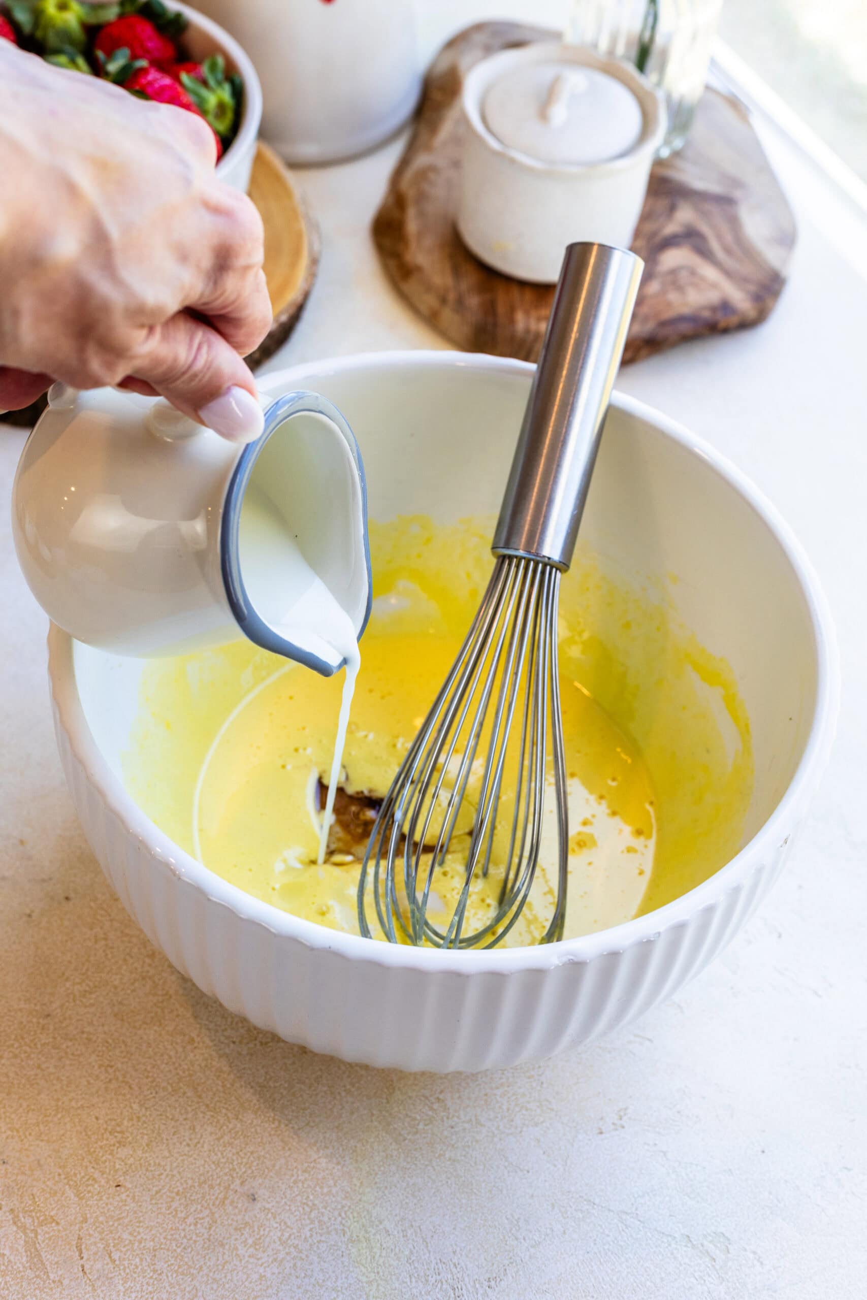 - Add the melted butter and whisk. Add the milk and the vanilla and whisk until combined.
