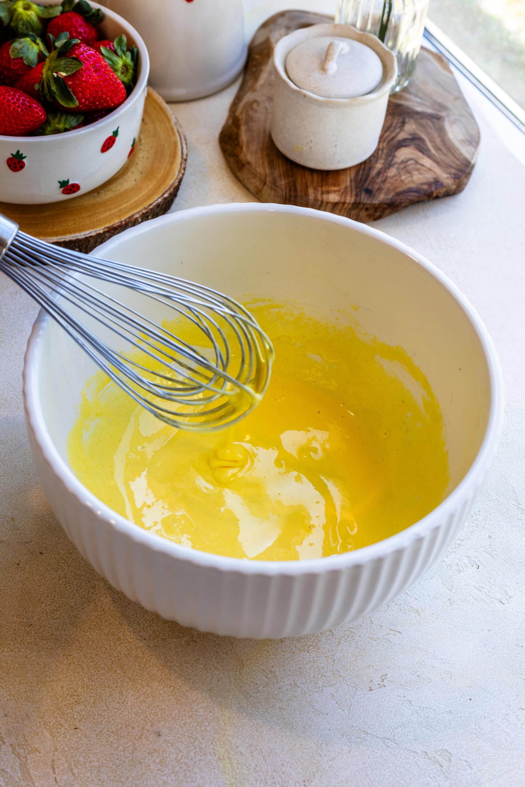 Whisk the egg yolks with the sugar until they look slightly paler and thicker, which takes about two minutes. This helps dissolve the sugar and creates a smoother base.