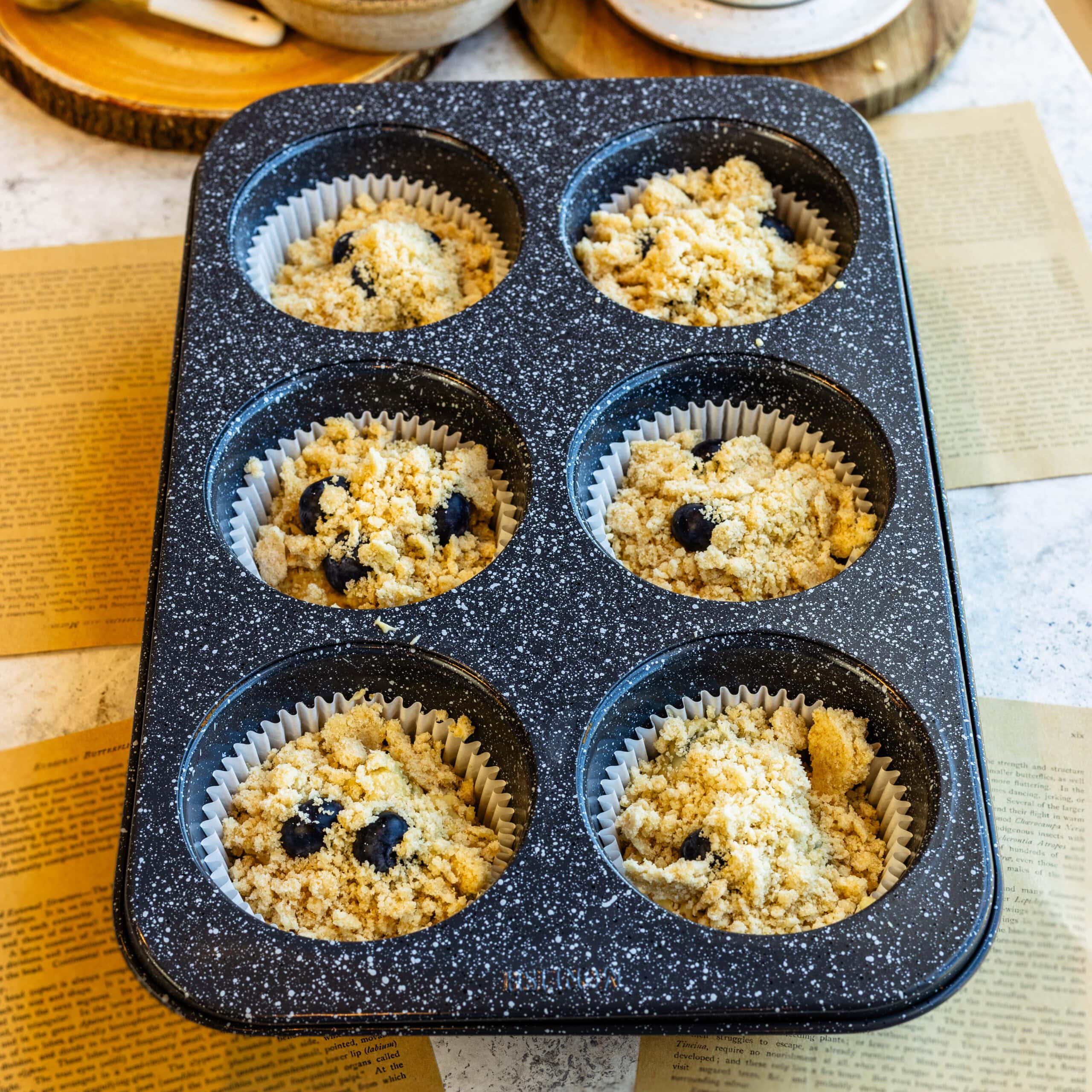 - Sprinkleย the crumble generously over each muffin.