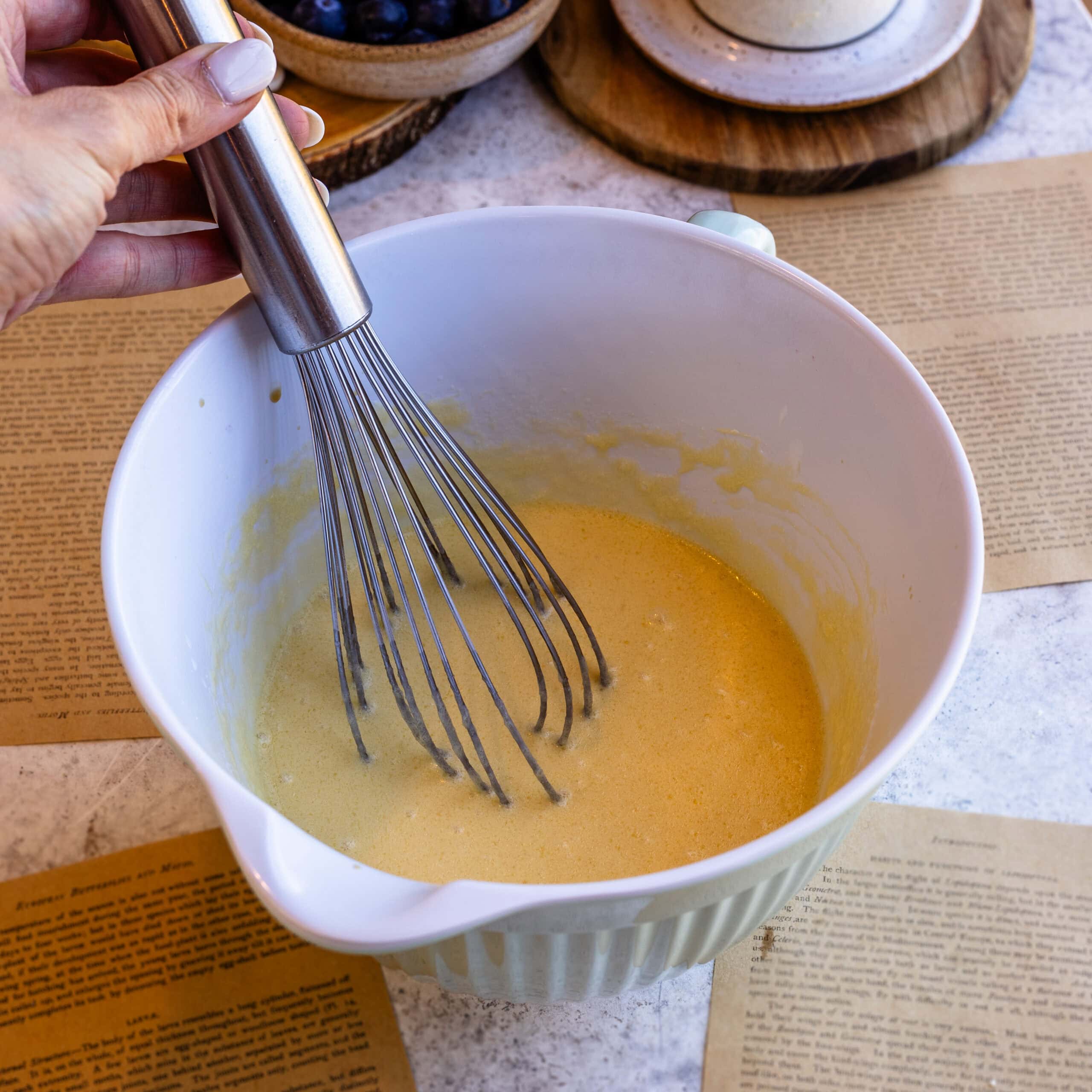 - Melt the butter in a bowl and let it cool slightly so it doesnโt scramble theย eggs. Add theย eggsย and whisk until smooth and glossy. Pour in the buttermilk and theย vanilla, and mix until fully combined.
