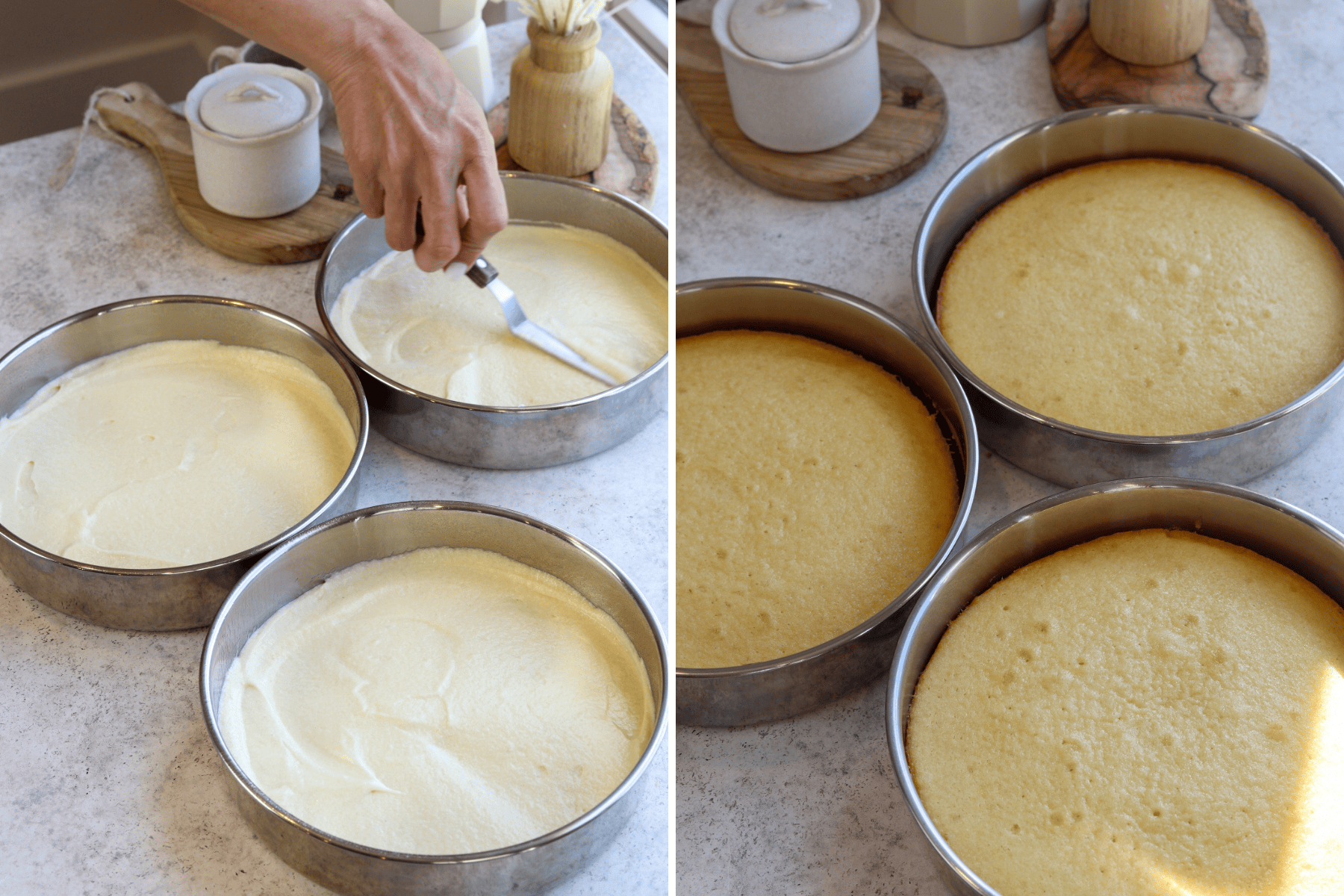 Divide the batter evenly between each prepared round cake pans and smooth the tops with an offset spatula. Bake for 30 minutes, or until a toothpick inserted in the center comes out clean. Let the cakes cool in their pans for 10 minutes before flipping them onto a wire rack to cool completely. If assembling later, wrap the cooled cakes in plastic wrap and store them in the fridge or freezer.