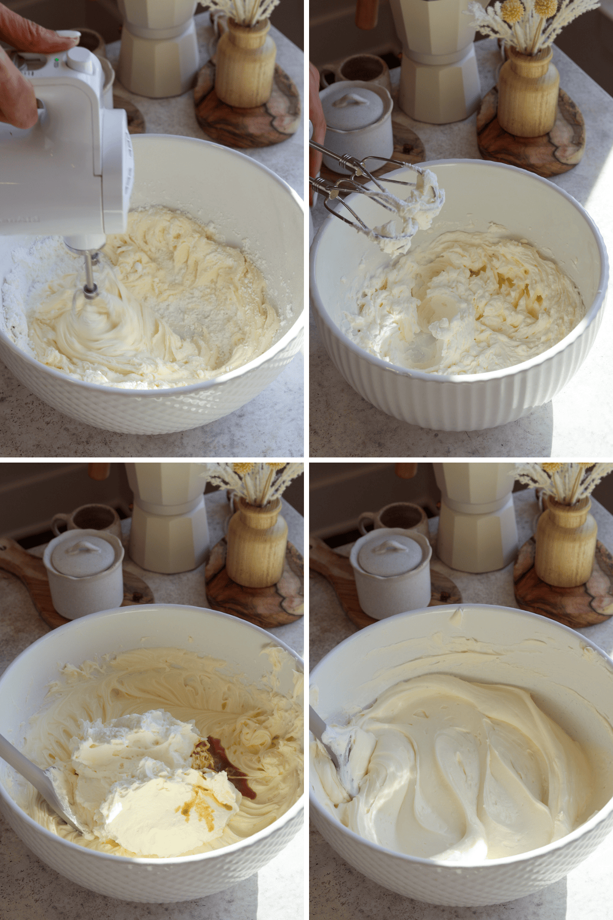 - Place the cold mascarpone and 2ยฝ cups of the powdered sugar to a bowl and beat for 1 minute, or until incorporated. Set aside.
