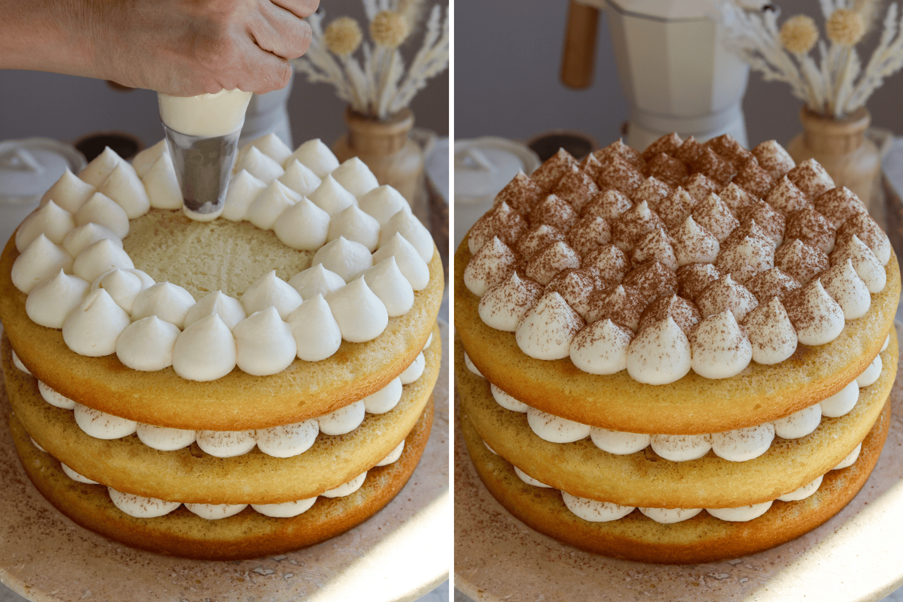 For the final layer, repeat the process one last time, using the remaining frosting to decorate the top. Finish with a generous dusting of cocoa powder for that signature tiramisu finish.