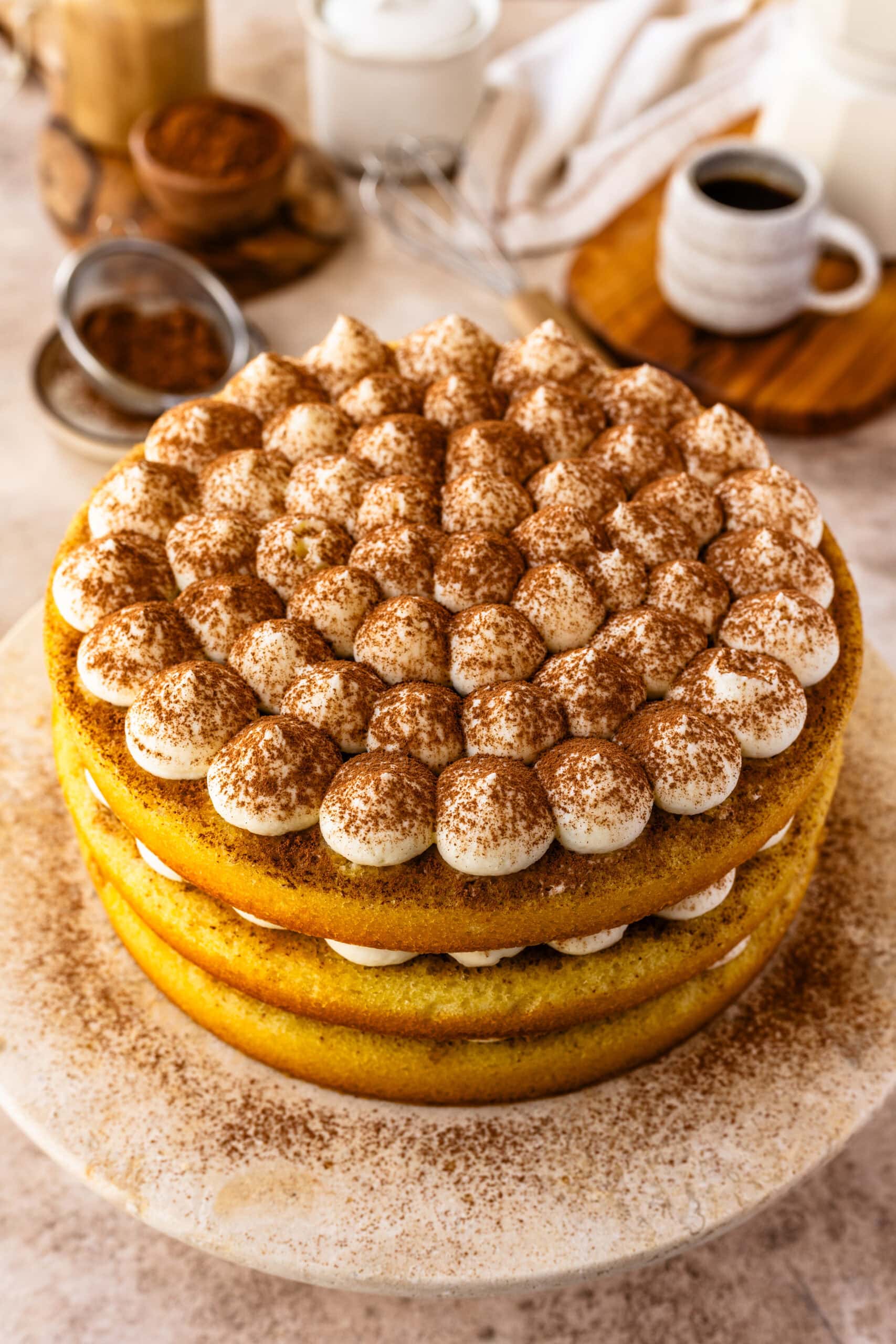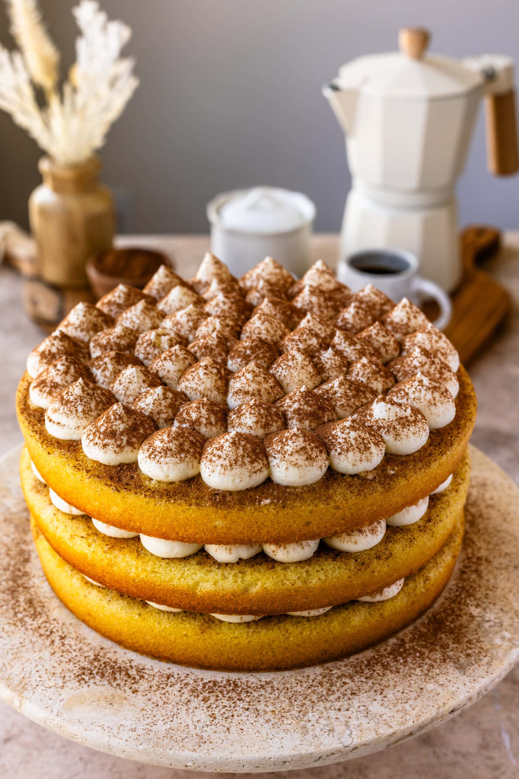 Hello friends! This Tiramisu Cake takes all the flavors of traditional tiramisu and transforms them into a beautifully layered dessert. Soft vanilla cake is soaked with espresso and coffee liqueur, then layered with a light and creamy mascarpone frosting. A dusting of cocoa powder on top completes the cake, giving it that signature tiramisu look and flavor. Perfect for coffee lovers, this cake is elegant yet simple to make, with just the right balance of sweetness and rich espresso flavor.