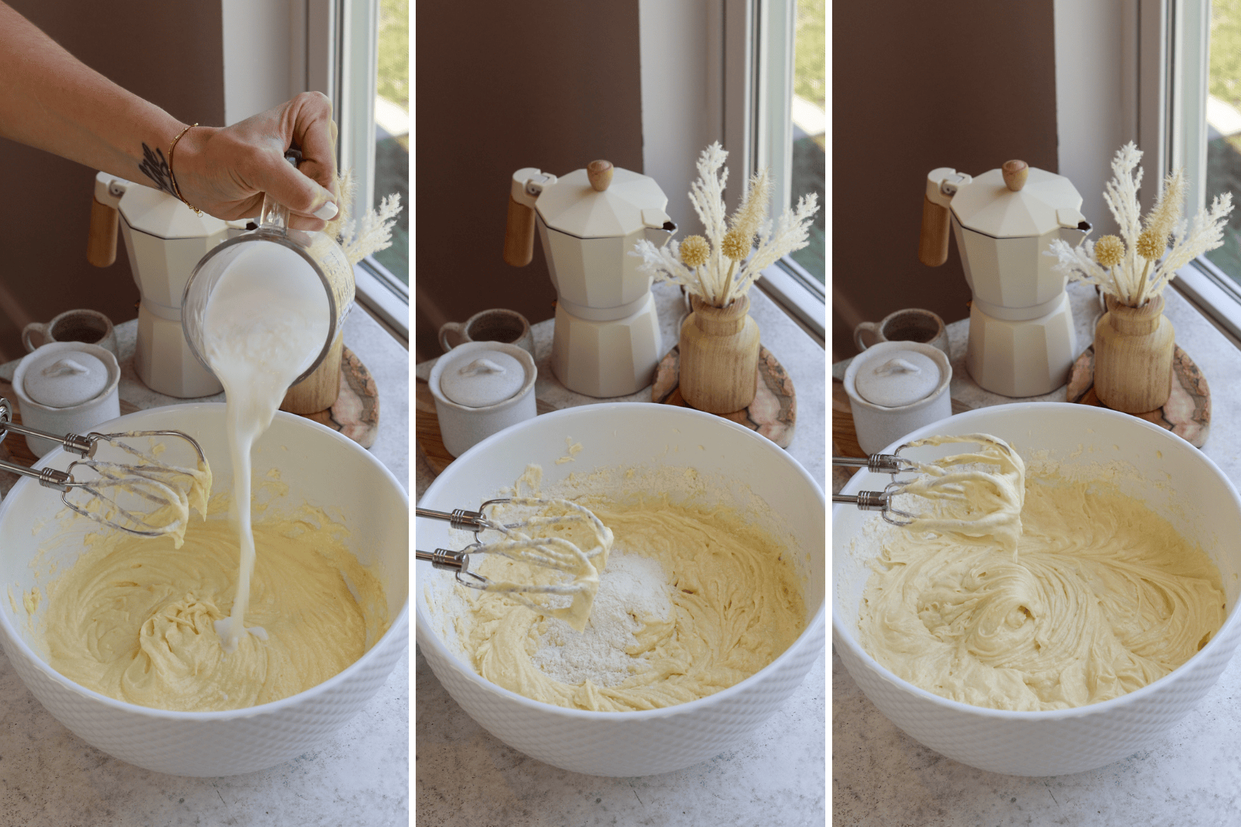 - Add one third of the buttermilk to the bowl with the batter, mix on low to combine.
