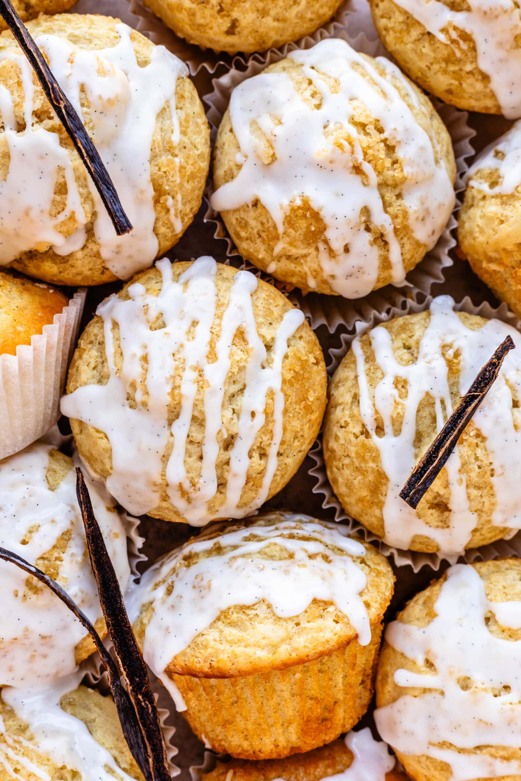 These vanilla muffins are soft, fluffy, and gently sweet, with a tender crumb that melts as you bite into it. Theyโre flavored with real vanilla and finished with a simple vanilla glaze that adds just enough sweetness without overpowering the muffin itself. I like to make these when I need something fast! If Iโm throwing an impromptu brunch or a friend is coming to visit at the last minute, Iโll whip these up, throw them in the oven, and theyโll be ready within the hour.