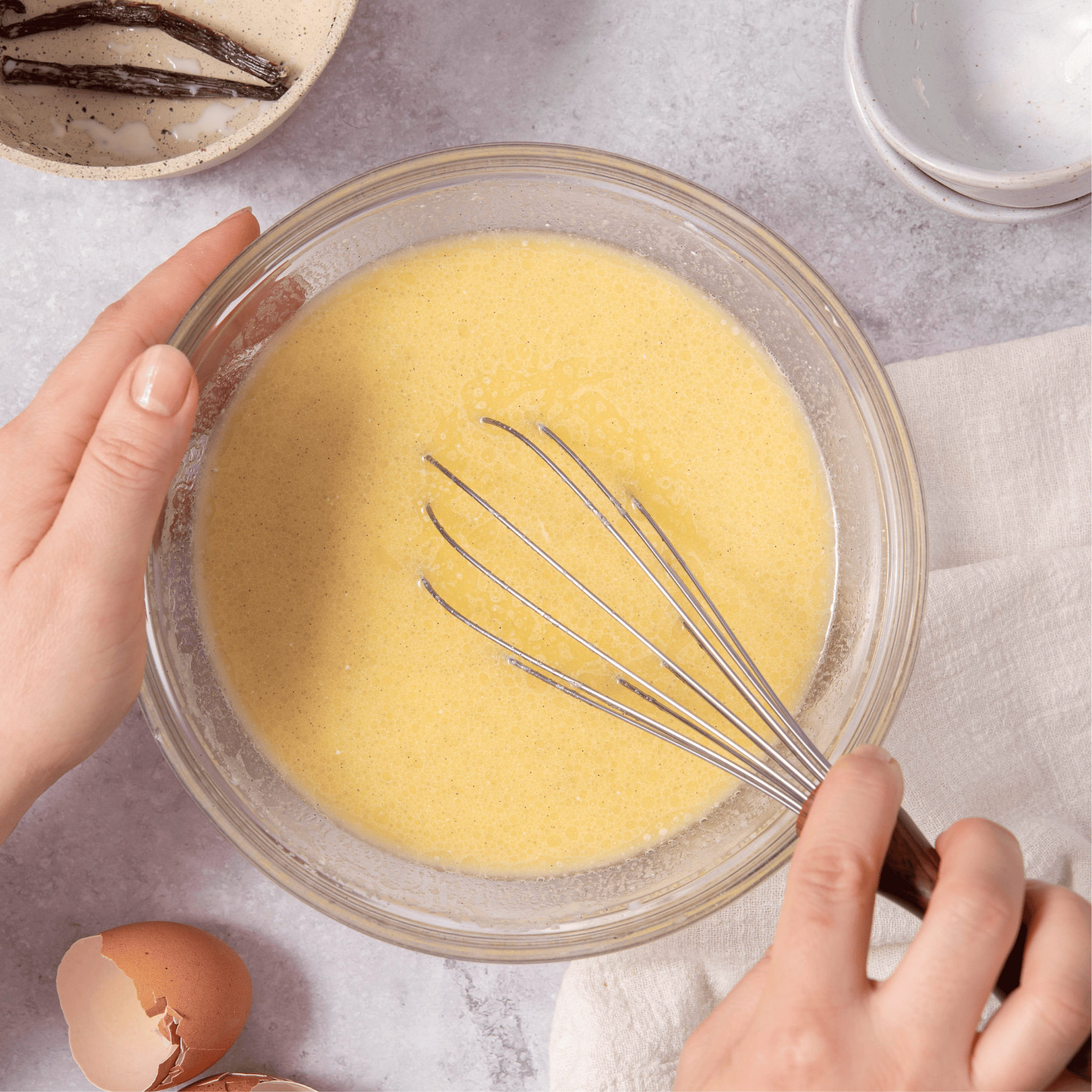 I split the vanilla bean lengthwise, scrape the seeds into the milk, and add the pod as well. I gently heat the milk just until the first bubbles appear, then remove it from the heat and let it cool to room temperature. Once cooled, I discard the pod.