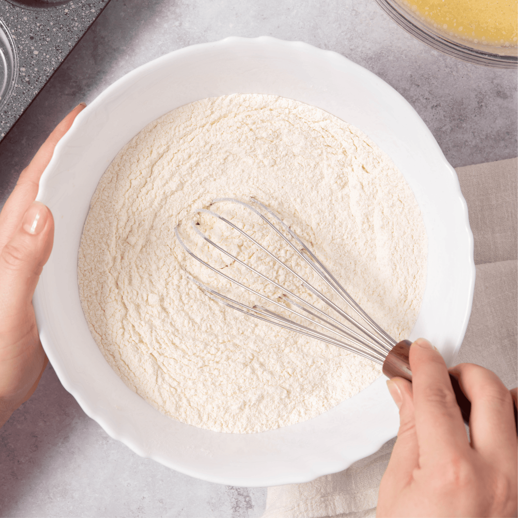 In a separate bowl, I whisk together the flour, sugar, baking powder, baking soda, and salt.