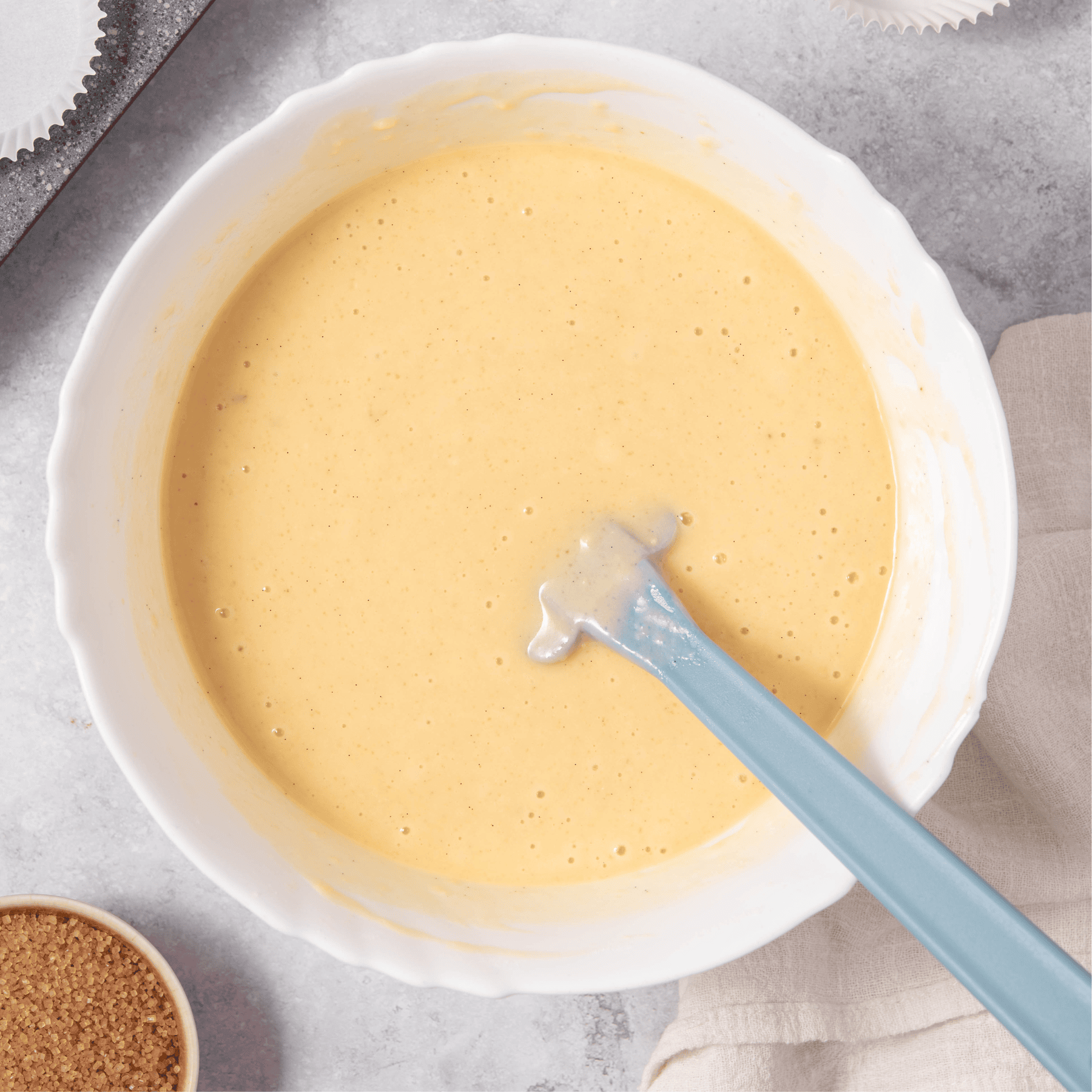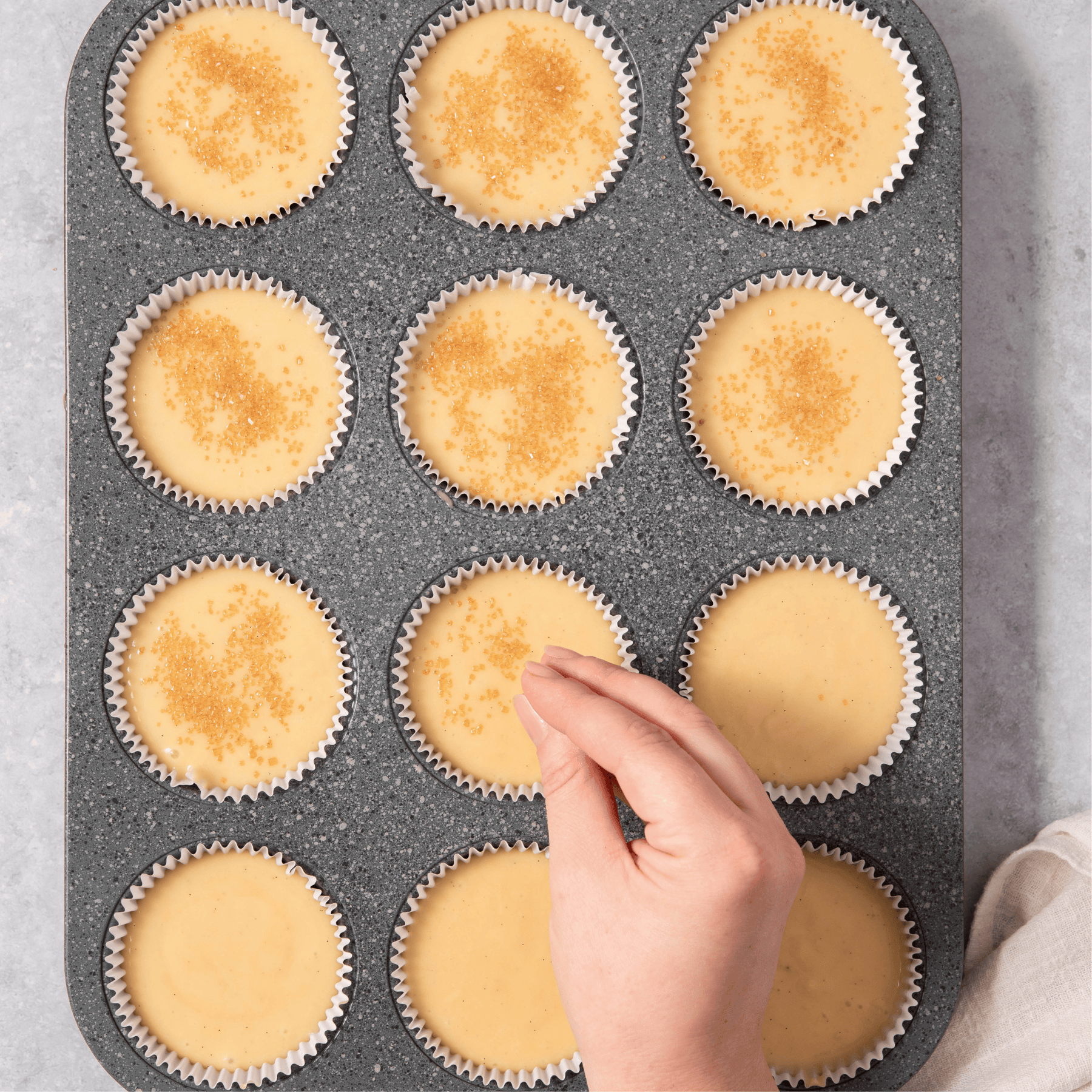 I divide the batter into a lined muffin pan, filling each cavity about ยพ full, then sprinkle coarse sugar on top for a crisp, bakery-style finish.