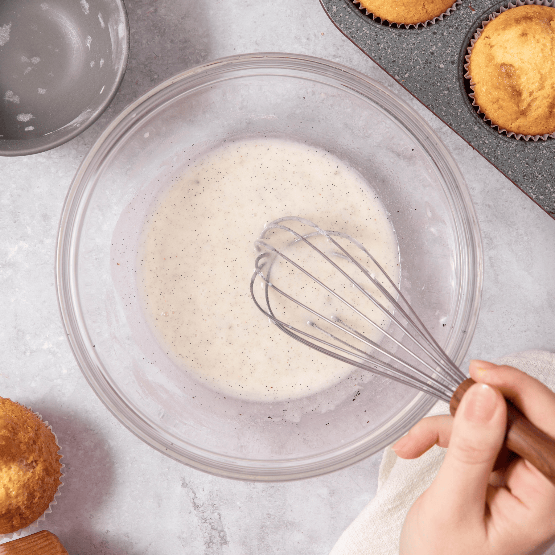 I like to start by infusing the milk with vanilla when Iโm using a whole vanilla bean. Itโs not required if youโre pressed for time, but it adds a deeper, more fragrant vanilla flavor that really comes through in the finished muffins.
