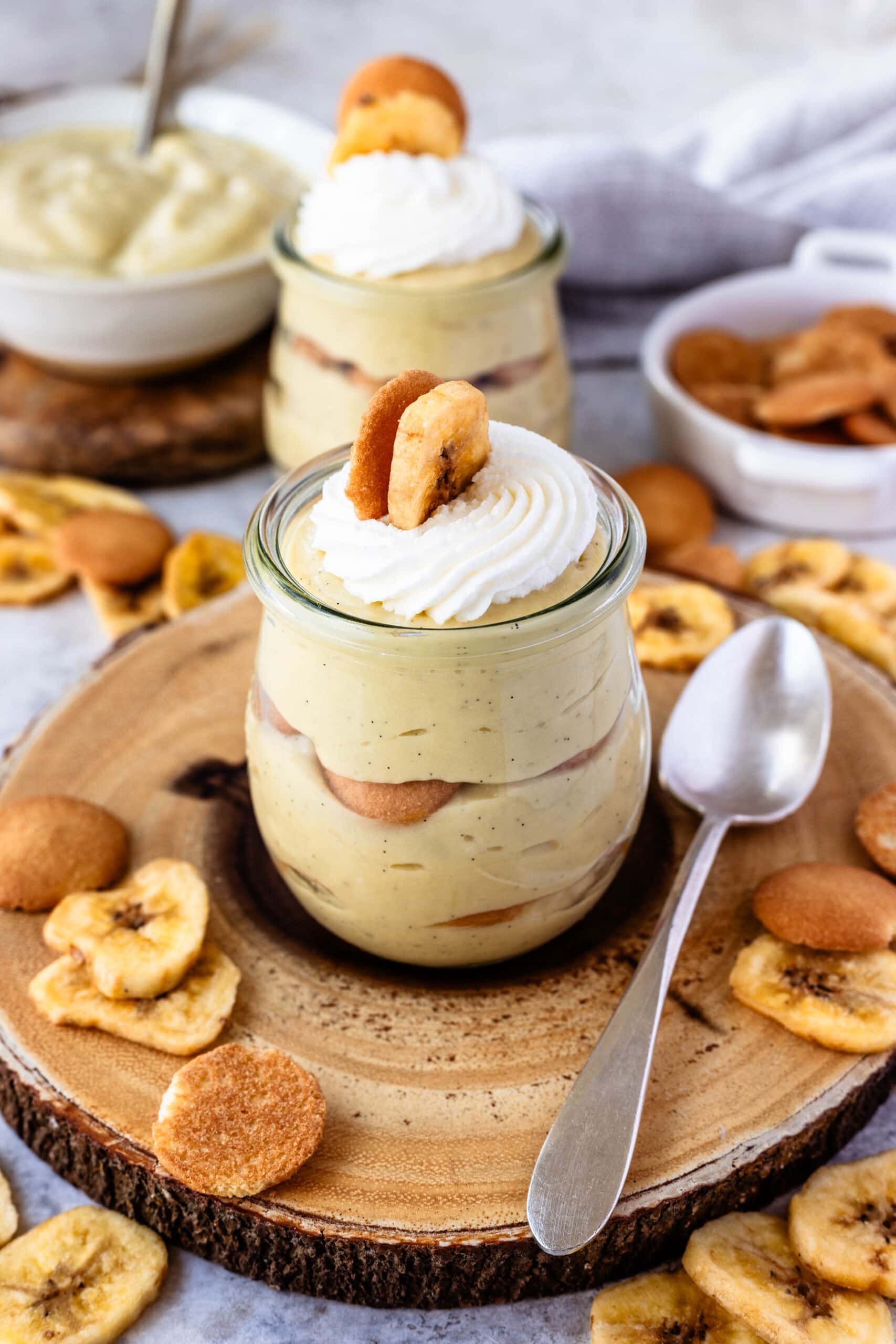 To assemble the pudding cups, pipe or spoon a layer of pudding on the bottom of the jars or dishes you are using. Top with a layer of sliced bananas, followed by a layer of vanilla wafer cookies. Repeat. I like to make this second layer of pudding the thickest one.
