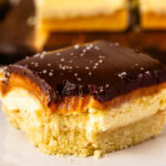 These Millionaire Shortbread Cheesecake Bars combine a tender shortbread crust, creamy cheesecake, buttery caramel, and a rich chocolate ganache topping.