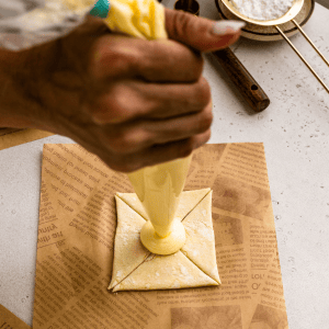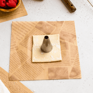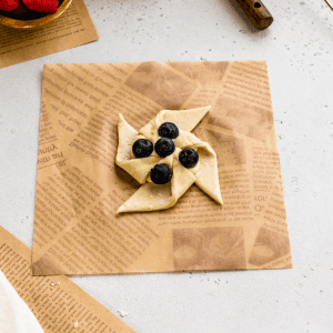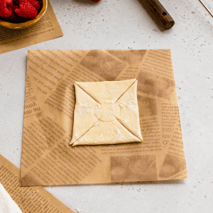 Use a very sharp knife or a pastry cutter to cut a slit going from the outer edges of this circle in the center to the corner. You must leave some room in the center where the pastry isn’t sliced, so you can fill it with the filling of choice before baking.
